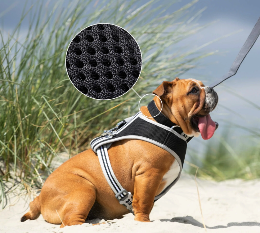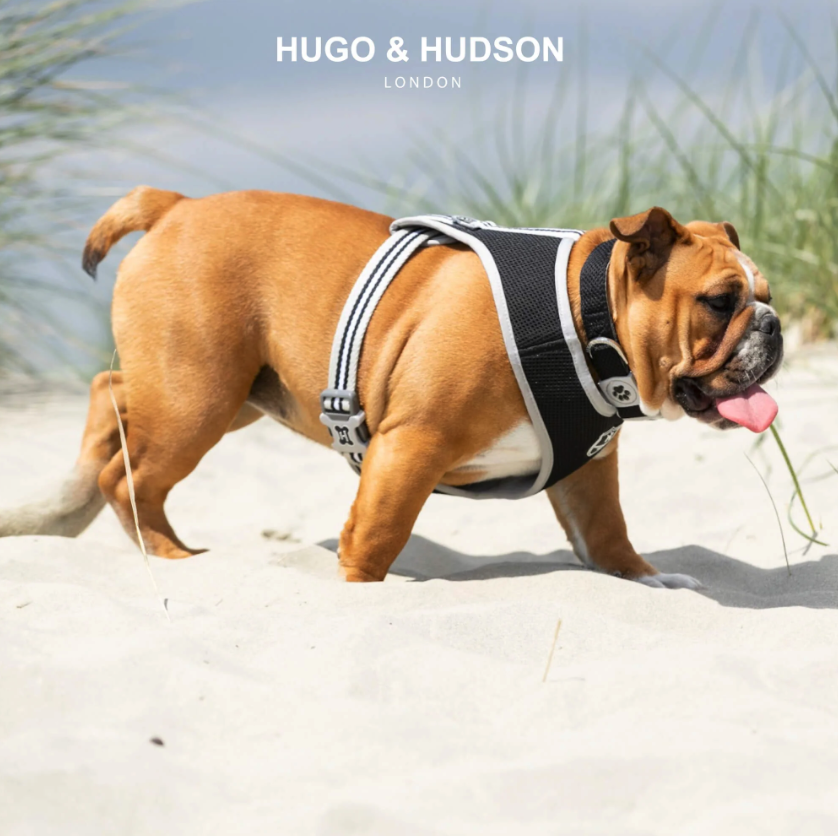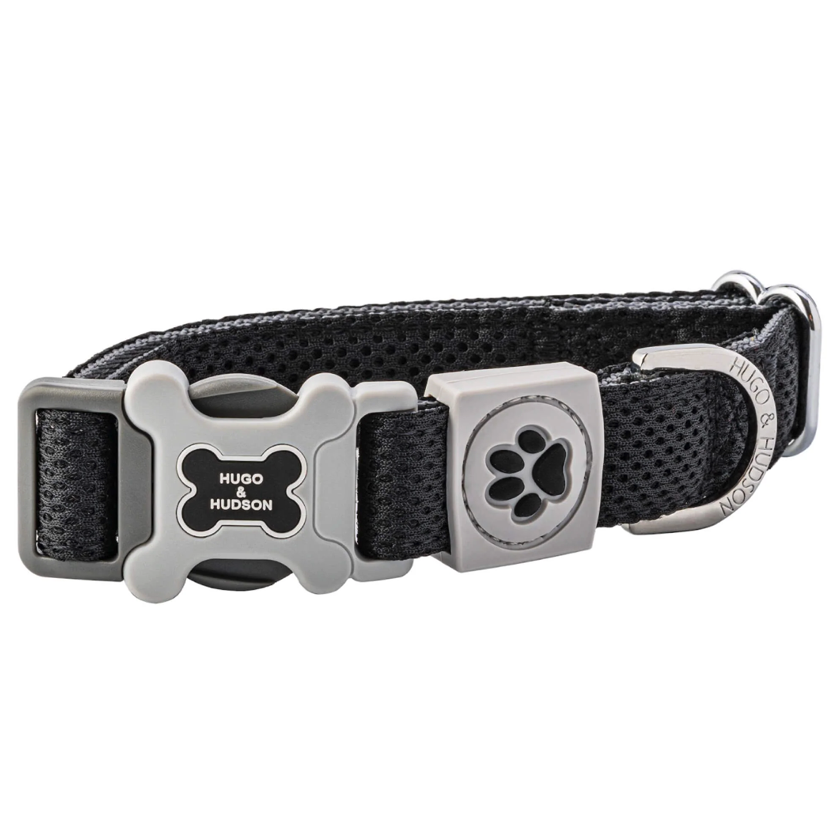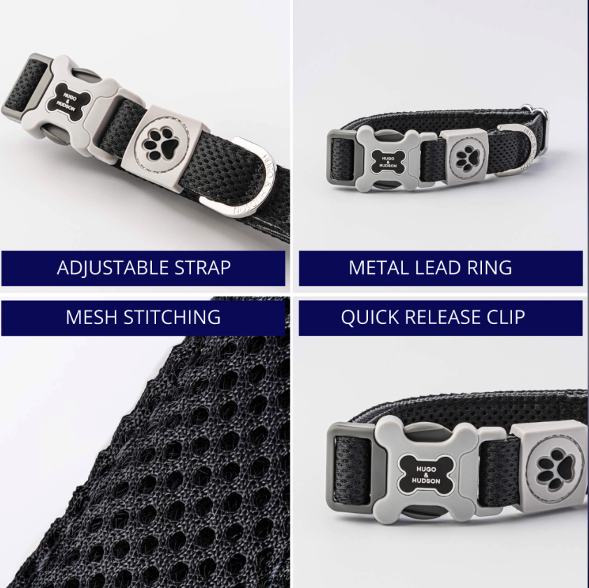 3D obojek Hugo & Hudson.  Síťovaný, měkký a čalouněný obojek zajišťuje vzdušnost kůže. Kroužky D poskytují zvýšenou bezpečnost a přezky byly podrobeny zátěžové zkoušce až do 147 kg.