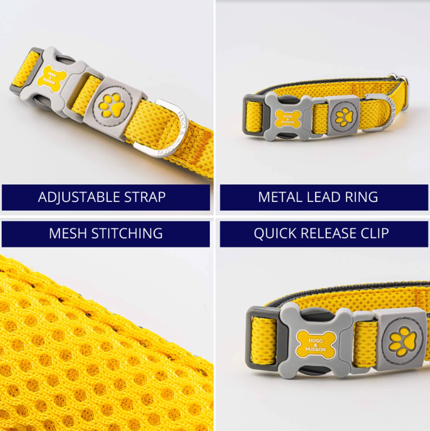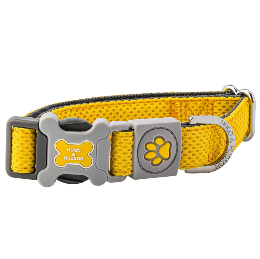 3D obojek Hugo & Hudson.  Síťovaný, měkký a čalouněný obojek zajišťuje vzdušnost kůže. Kroužky D poskytují zvýšenou bezpečnost a přezky byly podrobeny zátěžové zkoušce až do 147 kg.