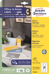 Adresní etikety Avery Zweckform 7160-10 do kanceláře, obchodu i domácnosti, ideální na tisk zpátečních adres na veškeré formáty obálek, zásilek, balíčků apod. Extra silný materiál etiket s vysokou lepivostí na běžných površích jako papír, karton, sklo a plast. Díky praktické pomůcce QuickPEEL™ můžete jednotlivé etikety odlepovat z archu snadno a rychle. Novinka! Jedinečná výrobní technologie Ultragrip – do oblasti záhlaví a zápatí na přední straně archu s etiketami aplikovaný strukturovaný povrch zaručí bezchybné natažení archu do tiskárny a absolutně přesný tisk bez rizika uvíznutí archu v tiskárně. Při tisku se můžete spolehnout na čtyřstranný bezpečnostní okraj QCT (Quattro Clean Technology), který zabraňuje vytékání a usazování lepidla v tiskárně a ostrý tiskový výstup, který se díky vynikajícímu ukotvení tonerového prášku či inkoustu nerozmazává. Bezproblémový provoz laserových tiskáren testován a potvrzen certifikátem TÜV SÜD. Bílé samolepící adresní štítky Avery Zweckform 7160-10 jsou vhodné pro všechny běžné laserové i inkoustové tiskárny, kopírovací stroje a hodí se i pro psaní, resp. ruční popis.