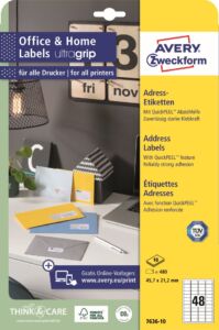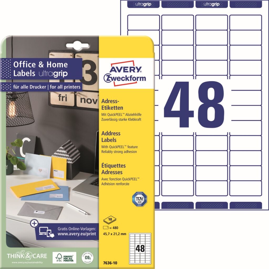 Adresní etikety Avery Zweckform 7636-10 do kanceláře, obchodu i domácnosti, ideální na tisk zpátečních adres na veškeré formáty obálek, zásilek, balíčků apod. Extra silný materiál etiket s vysokou lepivostí na běžných površích jako papír, karton, sklo a plast. Díky praktické pomůcce QuickPEEL™ můžete jednotlivé etikety odlepovat z archu snadno a rychle. Novinka! Jedinečná výrobní technologie Ultragrip – do oblasti záhlaví a zápatí na přední straně archu s etiketami aplikovaný strukturovaný povrch zaručí bezchybné natažení archu do tiskárny a absolutně přesný tisk bez rizika uvíznutí archu v tiskárně. Při tisku se můžete spolehnout na čtyřstranný bezpečnostní okraj QCT (Quattro Clean Technology), který zabraňuje vytékání a usazování lepidla v tiskárně a ostrý tiskový výstup, který se díky vynikajícímu ukotvení tonerového prášku či inkoustu nerozmazává. Bezproblémový provoz laserových tiskáren testován a potvrzen certifikátem TÜV SÜD. Bílé samolepící adresní štítky Avery Zweckform 7636-10 jsou vhodné pro všechny běžné laserové i inkoustové tiskárny, kopírovací stroje a hodí se i pro psaní, resp. ruční popis.