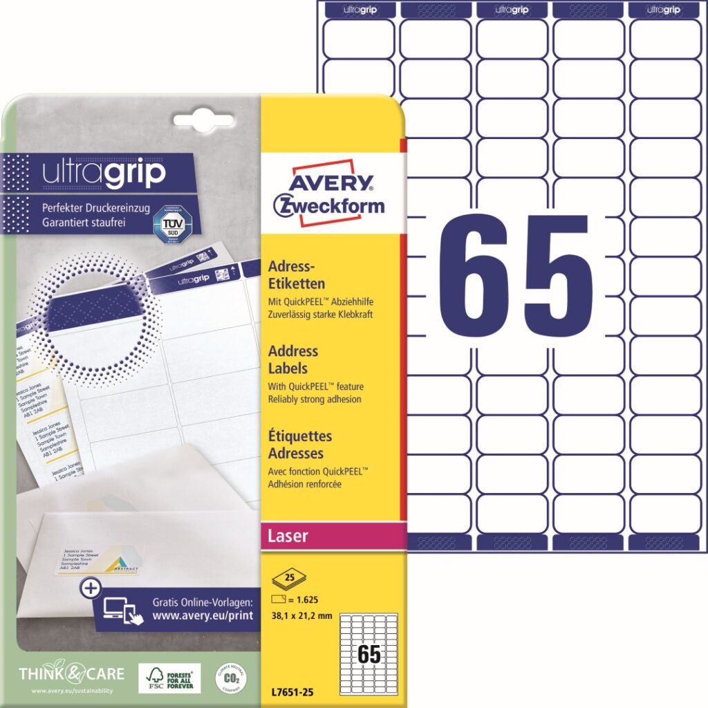 Adresní etikety Avery Zweckform L7651-25 do kanceláře, obchodu i domácnosti, ideální na tisk zpátečních adres na veškeré formáty obálek, zásilek, balíků apod. Extra silný materiál etiket s vysokou lepivostí na běžných površích jako papír, karton, sklo a plast. Díky praktické pomůcce QuickPEEL™ můžete jednotlivé etikety z archu odlepovat snadno a rychle. Novinka! Jedinečná výrobní technologie Ultragrip – do oblasti záhlaví a zápatí na přední straně archu s etiketami aplikovaný strukturovaný povrch, zaručí bezchybné natažení archu do tiskárny a absolutně přesný tisk bez rizika uvíznutí archu v tiskárně. Při tisku se můžete spolehnout na čtyřstranný bezpečnostní okraj QCT (Quattro Clean Technology), který zabraňuje vytékání a usazování lepidla v tiskárně a ostrý tiskový výstup, který se díky vynikajícímu ukotvení tonerového prášku nerozmazává. Bezproblémový provoz laserových tiskáren testován a potvrzen certifikátem TÜV SÜD. Bílé samolepící adresní štítky Avery Zweckform L7651-25 jsou vhodné pro všechny běžné černobílé i barevné laserové tiskárny.