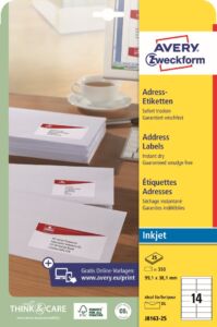 Inkjet adresní etikety Avery Zweckform J8163-25 do kanceláře, obchodu i domácnosti, ideální na tisk adres na veškeré formáty obálek, zásilek, balíků apod. Etikety jsou vyrobeny se speciální rychleschnoucí povrchovou úpravou QuickDry™. Vysoká lepivost na běžných površích jako papír, karton, sklo a plast. Při tisku se můžete spolehnout na plynulý průjezd archů tiskárnou bez uvíznutí a ostrý tiskový výstup, který se díky vynikajícímu přilnutí inkoustu nerozmazává. Samozřejmostí je čtyřstranný bezpečnostní okraj QCT (Quattro Clean Technology), který zabraňuje vytékání a usazování lepidla v tiskárně. Bílé samolepící adresní štítky Avery Zweckform J8163-25 jsou vhodné pro všechny běžné inkoustové tiskárny.
