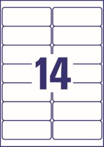 rozměr 99,1×38,1 mm, 25 archů A4, 350 ks etiket v balení (14 ks/arch), papírové, permanentní lepidlo, barva bílá. Typ tiskárny: inkoustová.