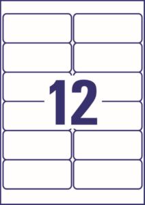 rozměr 99,1×42,3 mm, 25 archů A4, 300 ks etiket v balení (12 ks/arch), papírové, permanentní lepidlo, barva bílá. Typ tiskárny: inkoustová.