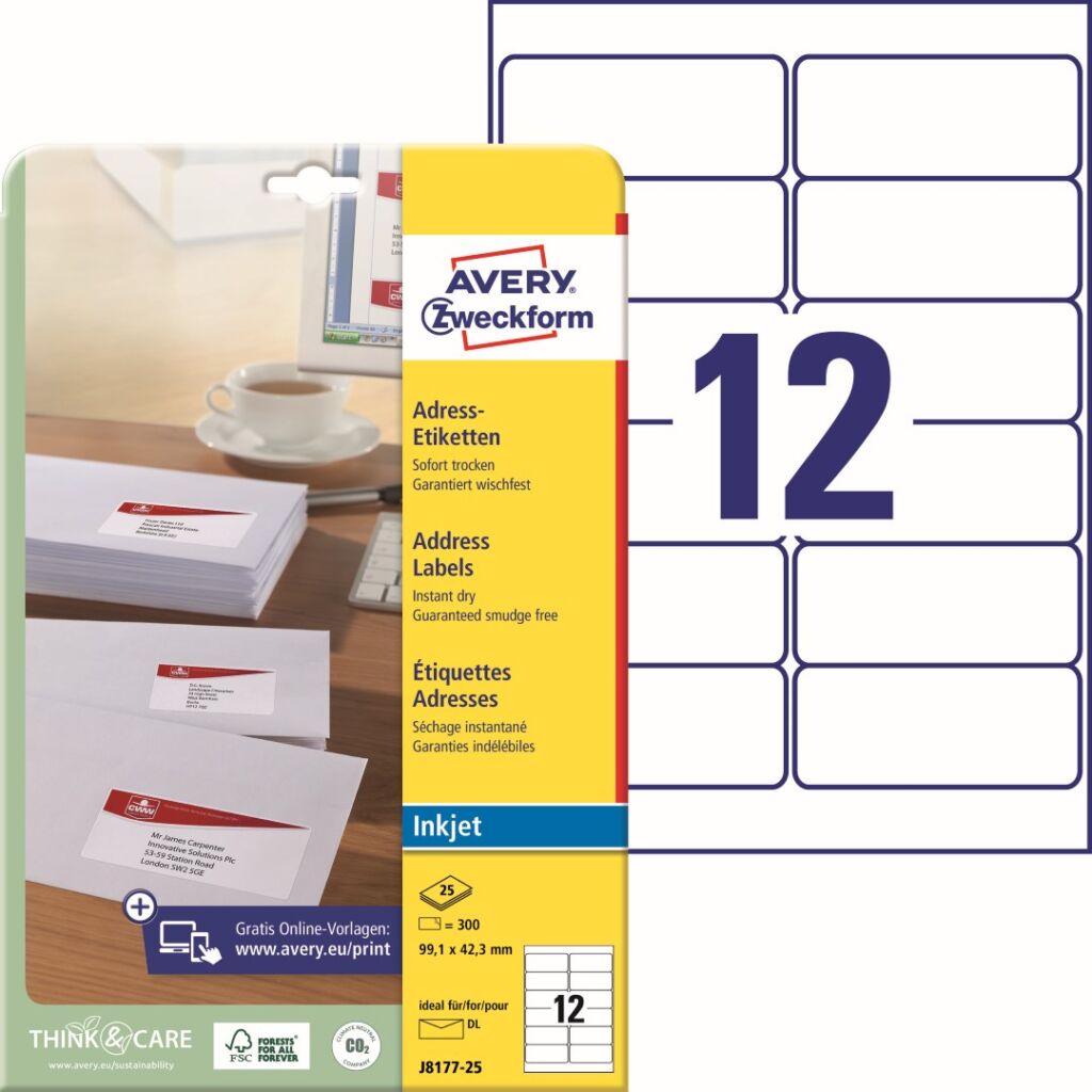 Inkjet adresní etikety Avery Zweckform J8177-25 do kanceláře, obchodu i domácnosti, ideální na tisk adres na veškeré formáty obálek, zásilek, balíků apod. Etikety jsou vyrobeny se speciální rychleschnoucí povrchovou úpravou QuickDry™. Vysoká lepivost na běžných površích jako papír, karton, sklo a plast. Při tisku se můžete spolehnout na plynulý průjezd archů tiskárnou bez uvíznutí a ostrý tiskový výstup, který se díky vynikajícímu přilnutí inkoustu nerozmazává. Samozřejmostí je čtyřstranný bezpečnostní okraj QCT (Quattro Clean Technology), který zabraňuje vytékání a usazování lepidla v tiskárně. Bílé samolepící adresní štítky Avery Zweckform J8177-25 jsou vhodné pro všechny běžné inkoustové tiskárny.