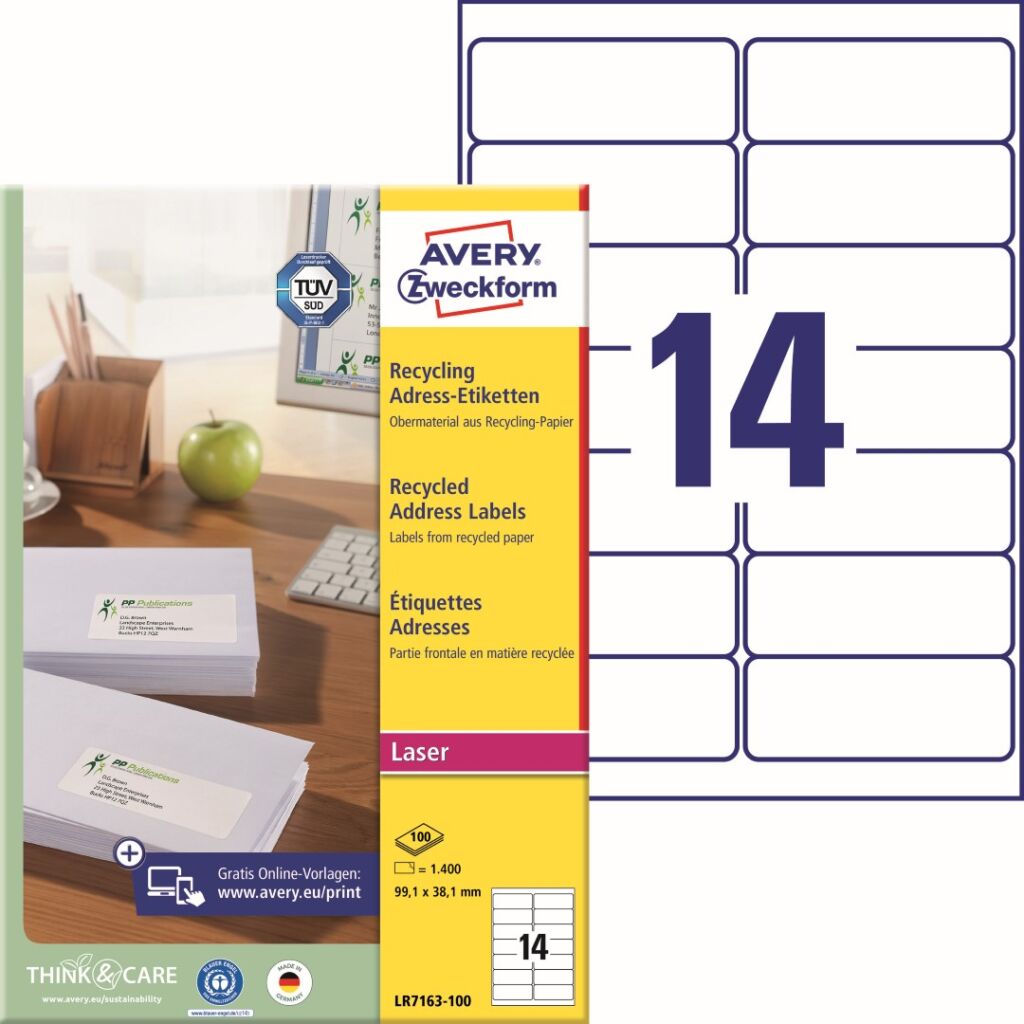 Recyklované adresní etikety Avery Zweckform LR7163-100 do kanceláře, obchodu i domácnosti, ideální na tisk zpátečních adres na veškeré formáty obálek, zásilek, balíků atd. Používejte produkty šetrné k životnímu prostředí! Vysoká a stálá lepivost na běžných površích jako papír, karton, sklo a plast. Díky praktické pomůcce QuickPEEL™, můžete jednotlivé etikety odlepovat z archu snadno a rychle. Ukázka viz Videa (záložka výše). Při tisku se můžete spolehnout na plynulý průjezd archů tiskárnou bez uvíznutí a ostrý tiskový výstup, který se díky vynikajícímu ukotvení tonerového prášku nerozmazává. Samozřejmostí je čtyřstranný bezpečnostní okraj QCT (Quattro Clean Technology), který zabraňuje vytékání a usazování lepidla v tiskárně. Bezproblémový provoz laserových tiskáren testován a potvrzen certifikátem TÜV SÜD. Bílé recyklované samolepící adresní štítky Avery LR7163-100 jsou vhodné pro všechny běžné černobílé i barevné laserové tiskárny.