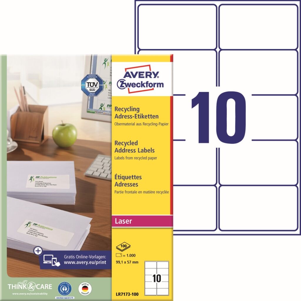 Recyklované adresní etikety Avery Zweckform LR7173-100 do kanceláře, obchodu i domácnosti, ideální na tisk zpátečních adres na veškeré formáty obálek, zásilek, balíků atd. Používejte produkty šetrné k životnímu prostředí! Vysoká a stálá lepivost na běžných površích jako papír, karton, sklo a plast. Díky praktické pomůcce QuickPEEL™, můžete jednotlivé etikety odlepovat z archu snadno a rychle. Ukázka viz Videa (záložka výše). Při tisku se můžete spolehnout na plynulý průjezd archů tiskárnou bez uvíznutí a ostrý tiskový výstup, který se díky vynikajícímu ukotvení tonerového prášku nerozmazává. Samozřejmostí je čtyřstranný bezpečnostní okraj QCT (Quattro Clean Technology), který zabraňuje vytékání a usazování lepidla v tiskárně. Bezproblémový provoz laserových tiskáren testován a potvrzen certifikátem TÜV SÜD. Bílé recyklované samolepící adresní štítky Avery LR7173-100 jsou vhodné pro všechny běžné černobílé i barevné laserové tiskárny.