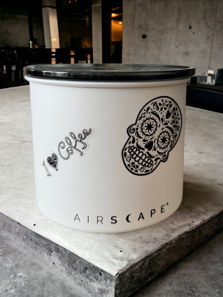 Nerezová dóza Airscape 300 g Planetary Design na uchování kávy čerstvé déle než v sáčku. K dóze Vám navíc přibalíme transparentní samolepku sugarskull lebky z našich motivů a samolepku s nápisem I love Coffee.