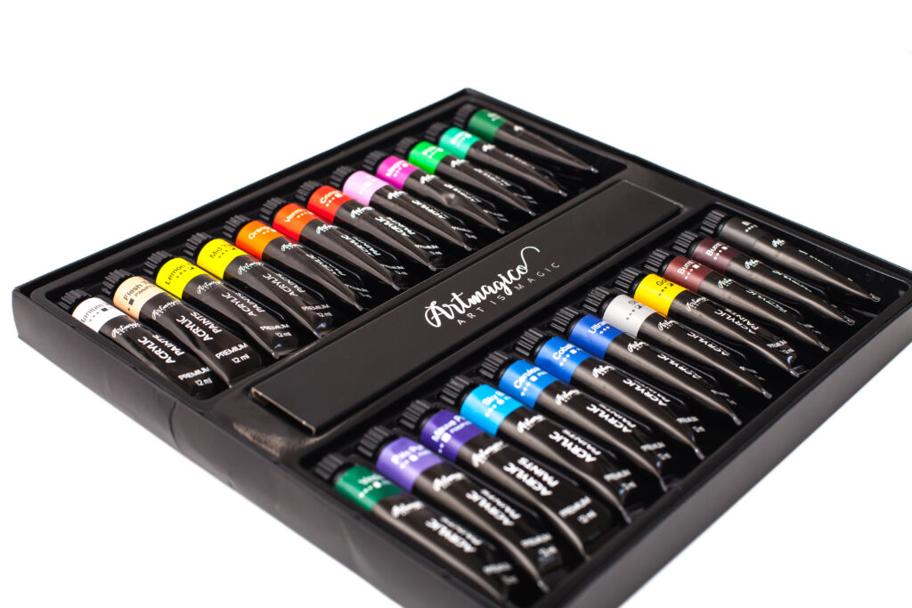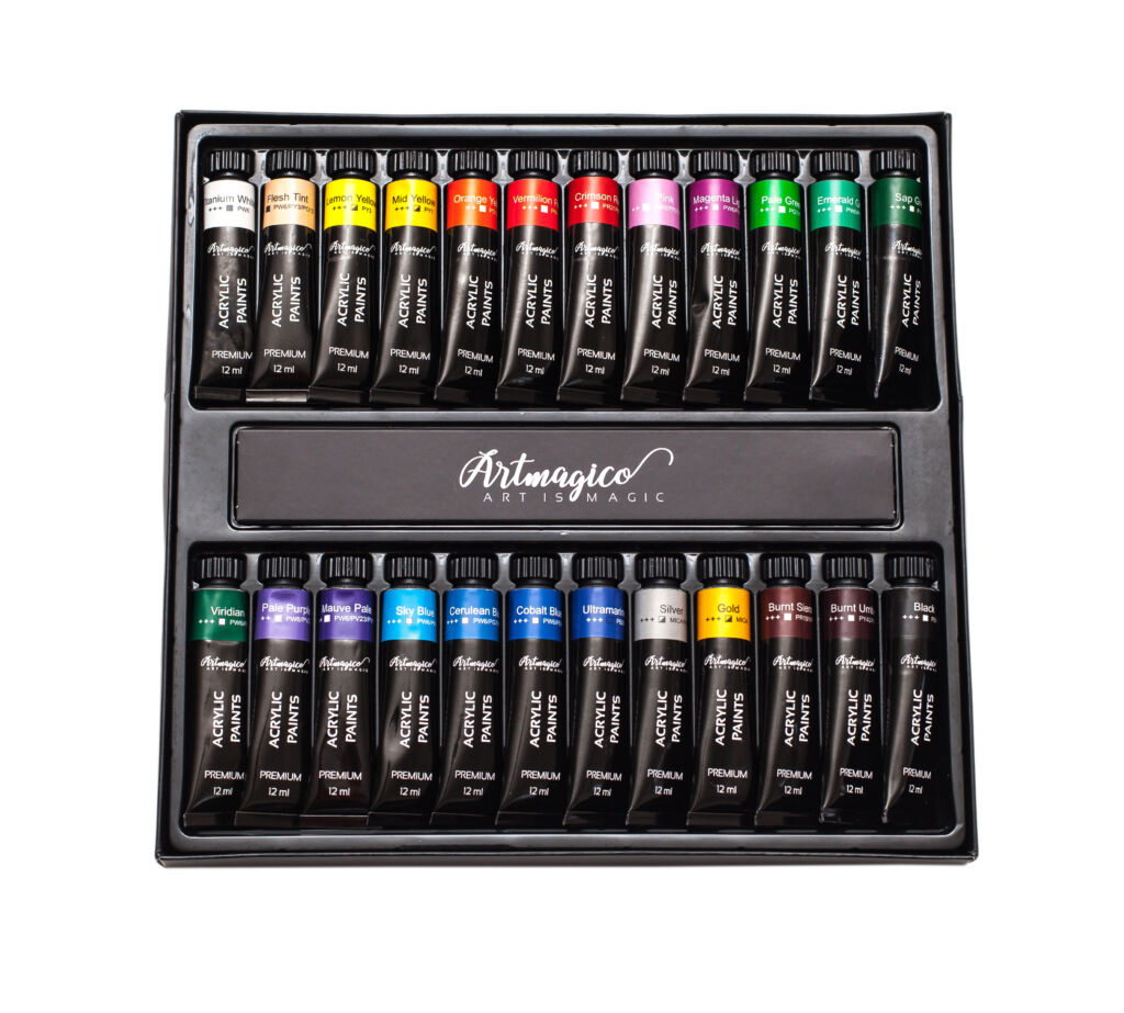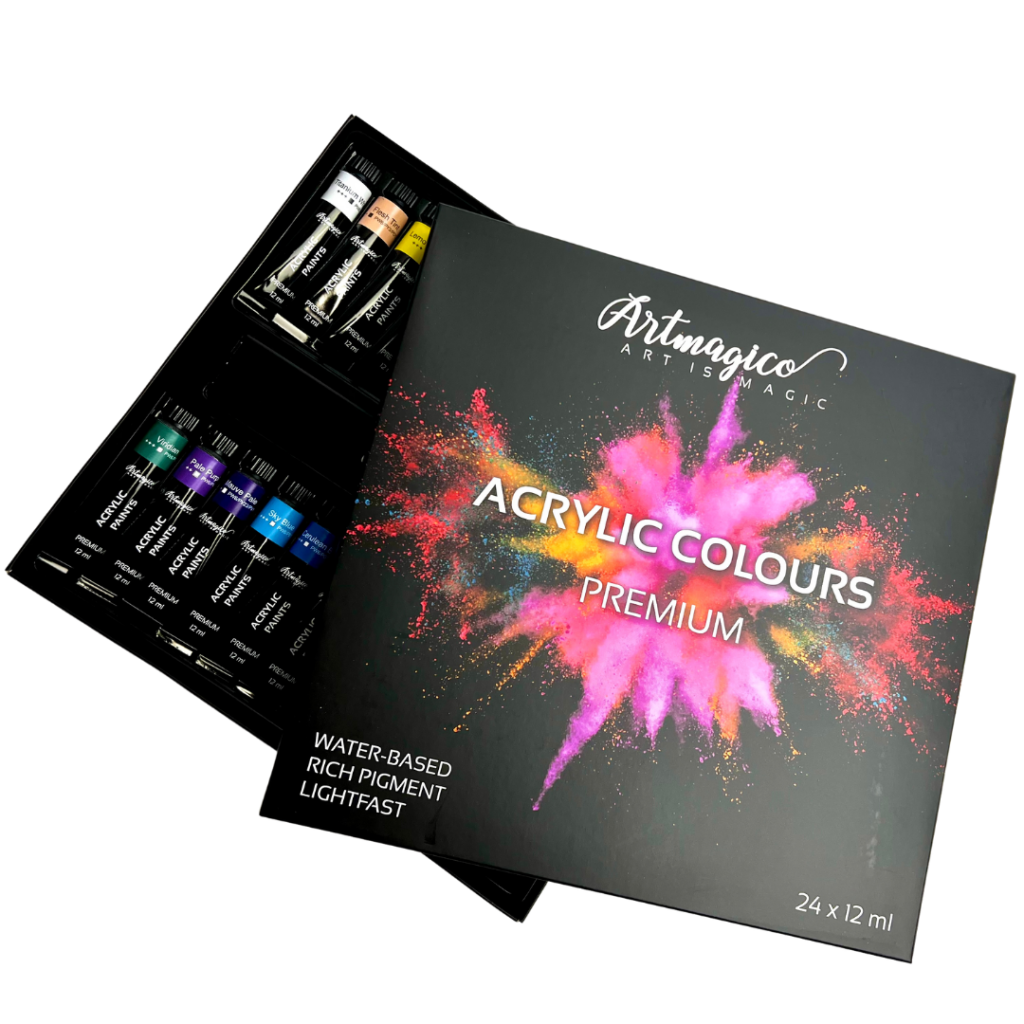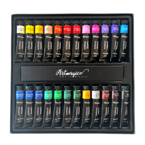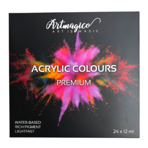 Akrylové barvy Artmagico jsou určené k umělecké tvorbě. Barvy jsou založené na vodní bázi a vynikají vysokým obsahem pigmentu, který zaručuje jejich perfektní krycí vlastnosti i na tmavém povrchu. Praktické dárkové balení barev Artmagico potěší každého umělce ať už se jedná o profesionála nebo nadšence. Akrylové barvy jsou skvělé pro práci na každém povrchu – od dřeva, plastu, plátna, kartonu až po koženku nebo látku. Barvy jsou vodou ředitelné a po zaschnutí se stávají voděodolné. Barvy Vás okouzlí lesklými, zářivými odstíny a krémovou konzistencí, díky tomu je využijete ke všem typům akrylové malby od práce štětcem, přes špachtle, až po strukturální malbu. Vynikají rychleschnoucími vlastnostmi.