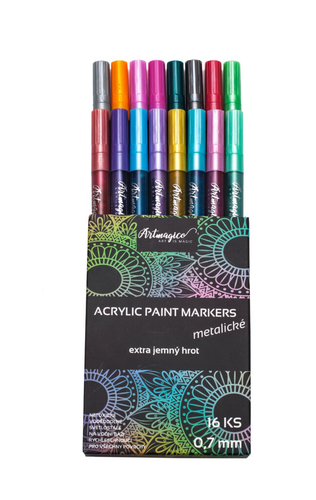 Akrylové popisovače obsahují inovativní inkoust na vodní bázi, jenž využijete na všechny typy povrchů. Fixy Artmagico zajišťují plynulý tok barvy, vysokou krycí schopnost a jasné a konzistentní barvy. V těle fixy najdete akrylovou barvu společně s pojivem, jejichž spojení je zajištěno kuličkou, která při štěrchání zajistí správnou konzistenci.