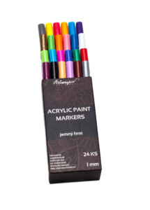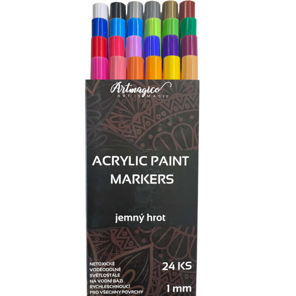 Akrylové fixy v sadě 24 kusů s jemným hrotem o šíři linky 1 mm v prémiové kvalitě. Perfektní inkoust se skvělými krycími vlastnostmi vhodný pro všechny typy malby a kreativní tvorby. Díky hrotu z porézního vlákna je použitelný na všechny povrchy a při práci neodstřikuje ani méně zdatnému malíři.