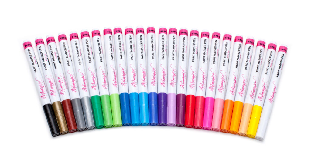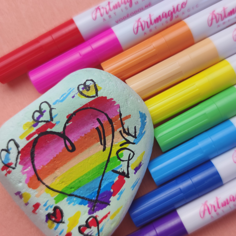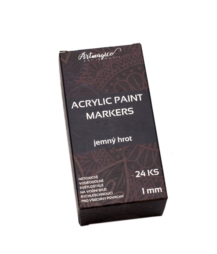 Akrylové popisovače obsahují inovativní inkoust na vodní bázi, jenž využijete na všechny typy povrchů. Fixy Artmagico zajišťují plynulý tok barvy, vysokou krycí schopnost a jasné a konzistentní barvy. V těle fixy najdete akrylovou barvu společně s pojivem, jejichž spojení je zajištěno kuličkou, která při štěrchání zajistí správnou konzistenci.