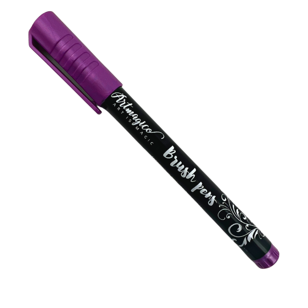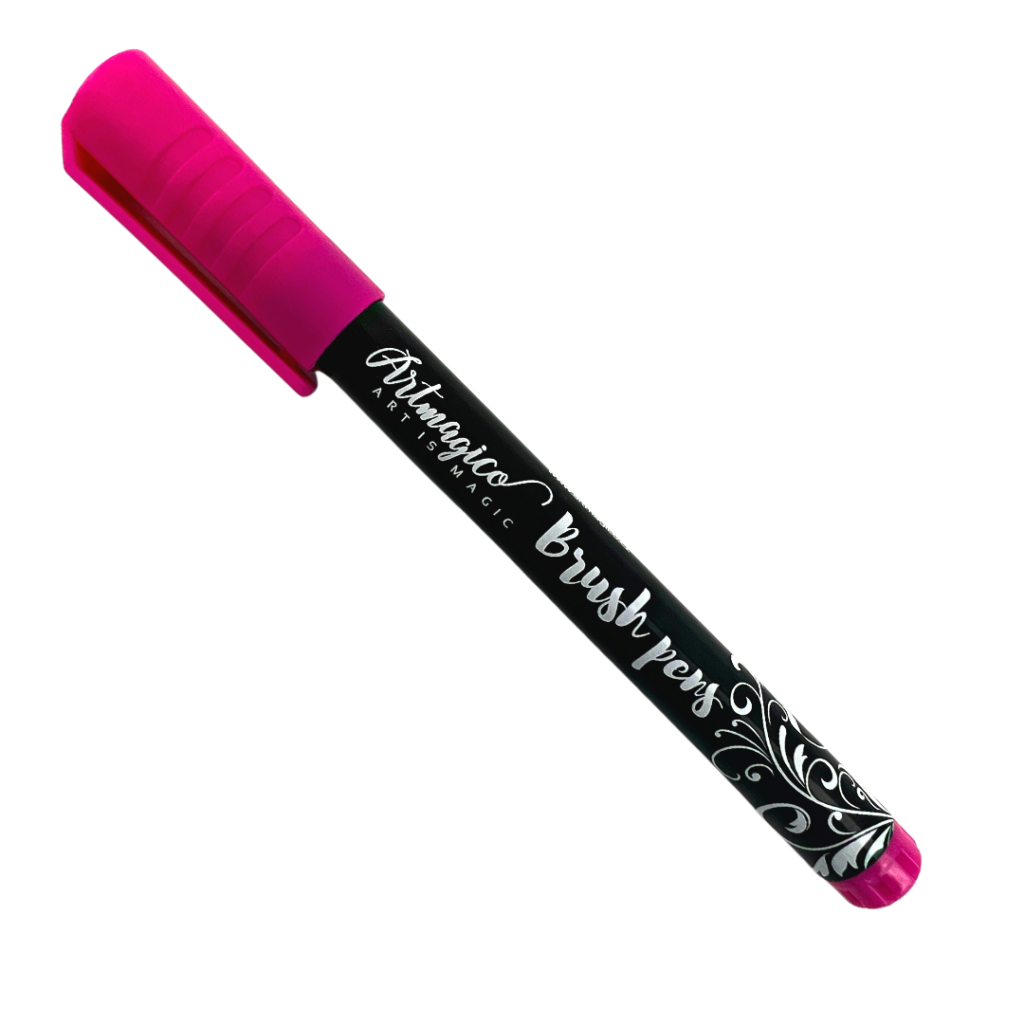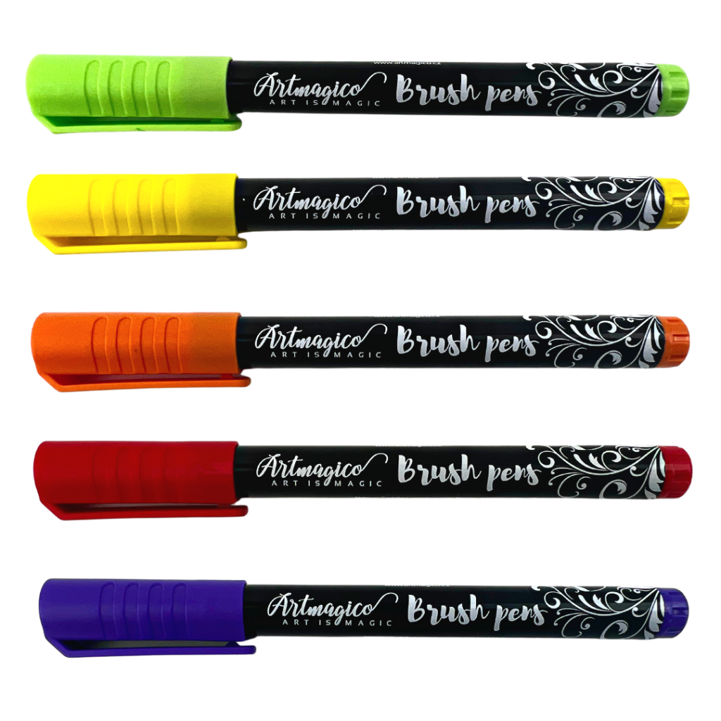 Artmagico Brush pens – spojují výhody dvou malířských nástrojů – fixů a štětce. Brush peny jsou fixy s hrotem, který je velmi podobný štětci. Takový hrot je vysoce přizpůsobivý a zvládnete díky němu vytvořit různé tloušťky linky. Linka se mění od tenké po širokou v závislosti na tlaku vyvíjeném na hrot. Dosáhnete tak snadno linky tloušťky od 1 do 3 mm. Brush peny jsou univerzálním nástrojem a využijete je při kaligrafii, letteringu, psaní, malování, scrapbookingu, ale také vybarvování. Vybírejte z 25 perfektně krycích fixů. Jejich vlastnosti využijete jak na bílém, tak černém povrchu. Fixy jsou díky svému inkoustu použitelné na všechny povrchy – černý i bílý papír, kámen, plast, železo, dřevo a další. Při použití na neporézní povrch je potřeba nechat inkoust řádně zaschnout a následně zalakovat.