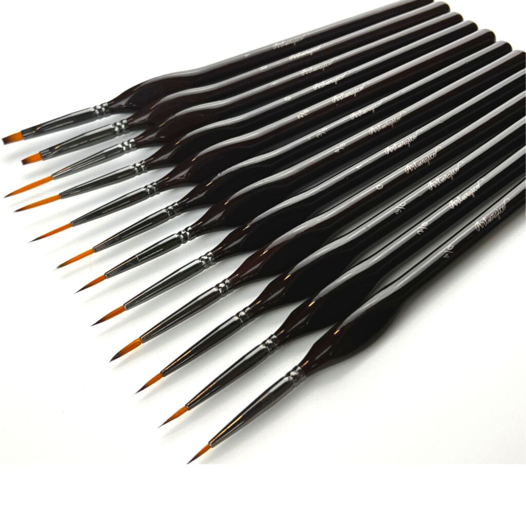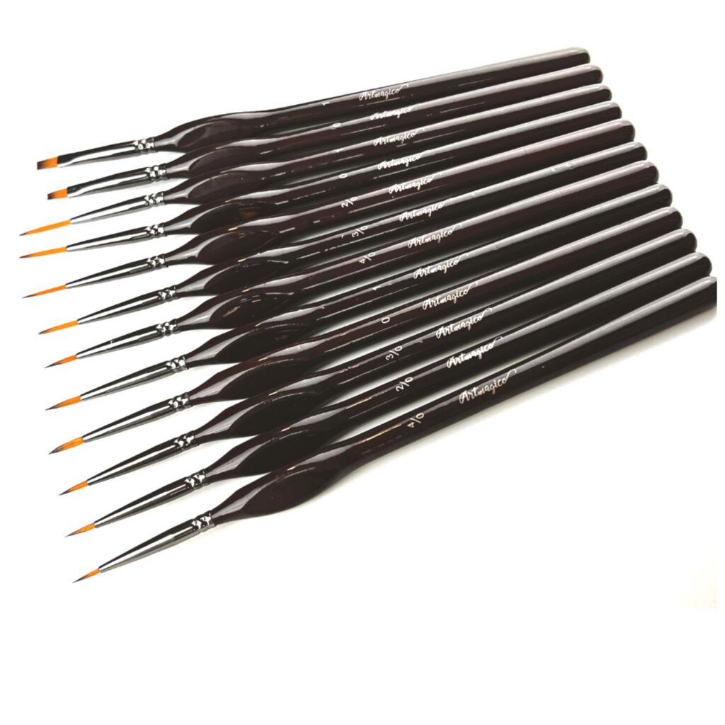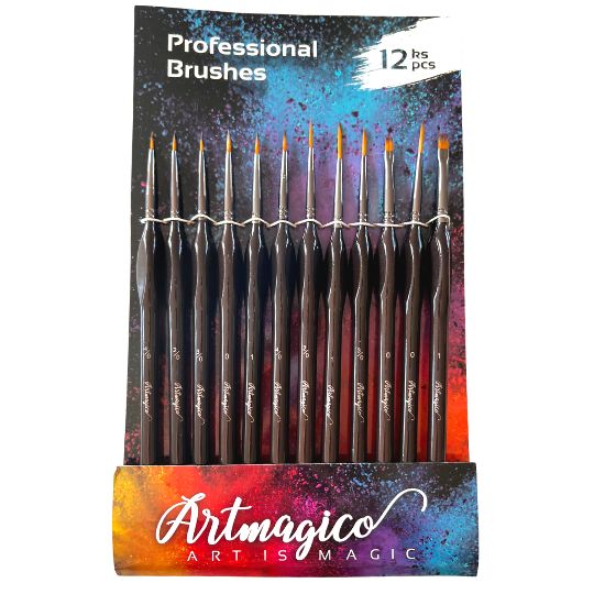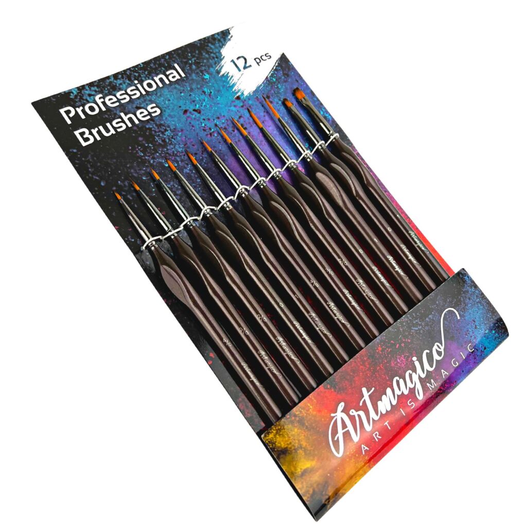 Dokonalé štětce od značky Artmagico jsou určené pro malbu detailů. Sada obsahuje 12 kusů štětců s jemnými a různě dlouhými vlasy vyrobenými ze syntetického vlákna. Štětce dokonale drží tvar a práce s nimi zajišťuje precizní výsledky. Štětiny štětce patří k těm jemnějším, díky tomu zvládnete namalovat s lehkostí ty nejjemnější kontury, zároveň štětce zvládnou i tužší strukturu barvy.