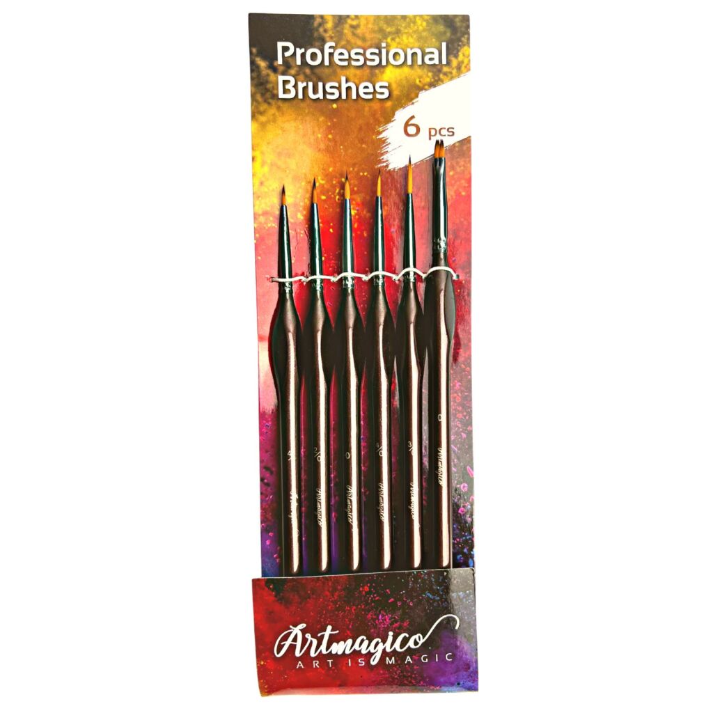 Dokonalé štětce od značky Artmagico jsou určené pro malbu detailů. Sada obsahuje 6 kusů štětců s jemnými a různě dlouhými vlasy vyrobenými ze syntetického vlákna. Štětce dokonale drží tvar a práce s nimi zajišťuje precizní výsledky. Štětiny štětce patří k těm jemnějším, díky tomu zvládnete namalovat s lehkostí ty nejjemnější kontury, zároveň štětce zvládnou i tužší strukturu barvy.