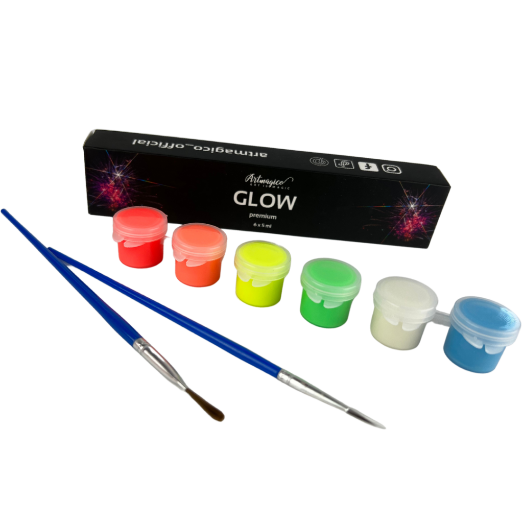 Barvy Artmagico s fosforeskujícím efektem obsahují svítící pigmentovaný prášek. Barvy jsou přes den transparentní, ta pravá zábava začíná večer. Obrázek pomalovaný těmito barvami nasviťte a zhasněte světlo. Svítící barvy můžete využít na všechny povrchy, a to díky akrylovému základu, který obsahují. Pozor tyto barvy nejsou hračkou a nejsou vhodné pro děti.