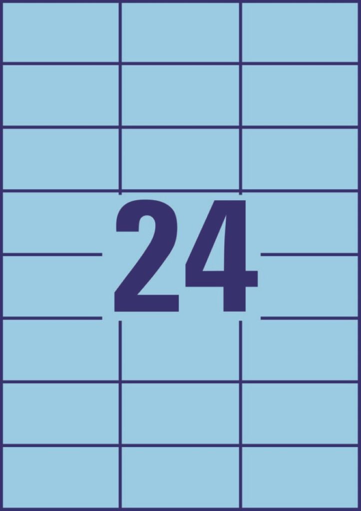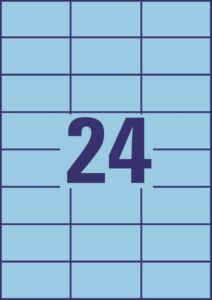 rozměr 70×37 mm, 100 archů A4, 2.400 ks etiket v balení (24 ks/arch), papírové, permanentní lepidlo, barva modrá. Typ tiskárny: černobílá laserová, barevná laserová, inkoustová.