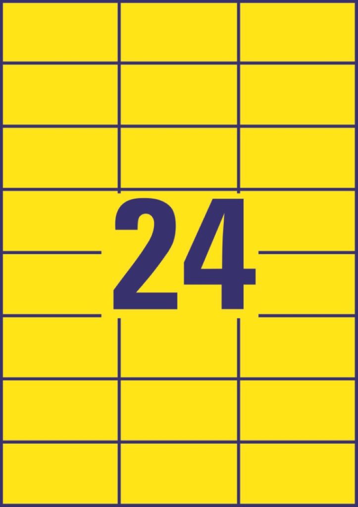 rozměr 70×37 mm, 100 archů A4, 2.400 ks etiket v balení (24 ks/arch), papírové, permanentní lepidlo, barva žlutá. Typ tiskárny: černobílá laserová, barevná laserová, inkoustová.