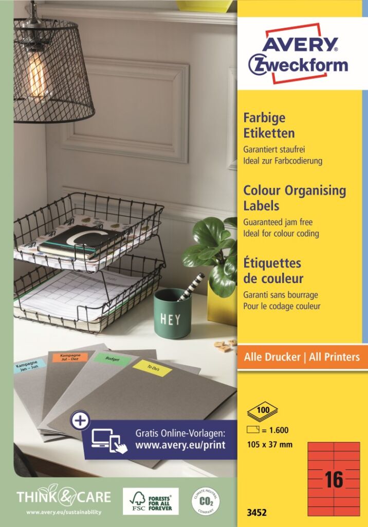 Červené samolepící etikety Avery Zweckform 3452 do kanceláře, obchodu i domácnosti, pro všestranné a spolehlivé použití. Ideální pro tematické barevné rozlišování nebo označování, akční a varovné samolepky, značení ve skladech a logistice, přehledné archivaci atd. Naše barevné etikety se vyznačují vysokou lepivostí na různých typech povrchů. Při tisku se můžete spolehnout na plynulý průjezd archů tiskárnou bez uvíznutí a ostrý tiskový výstup, který se díky vynikajícímu ukotvení tonerového prášku či inkoustu nerozmazává. Samozřejmostí je čtyřstranný bezpečnostní okraj QCT (Quattro Clean Technology), který zabraňuje vytékání a usazování lepidla v tiskárně. Červené print etikety Avery Zweckform 3452 jsou vhodné pro všechny běžné laserové i inkoustové tiskárny, kopírovací stroje a hodí se i pro psaní, resp. ruční popis.