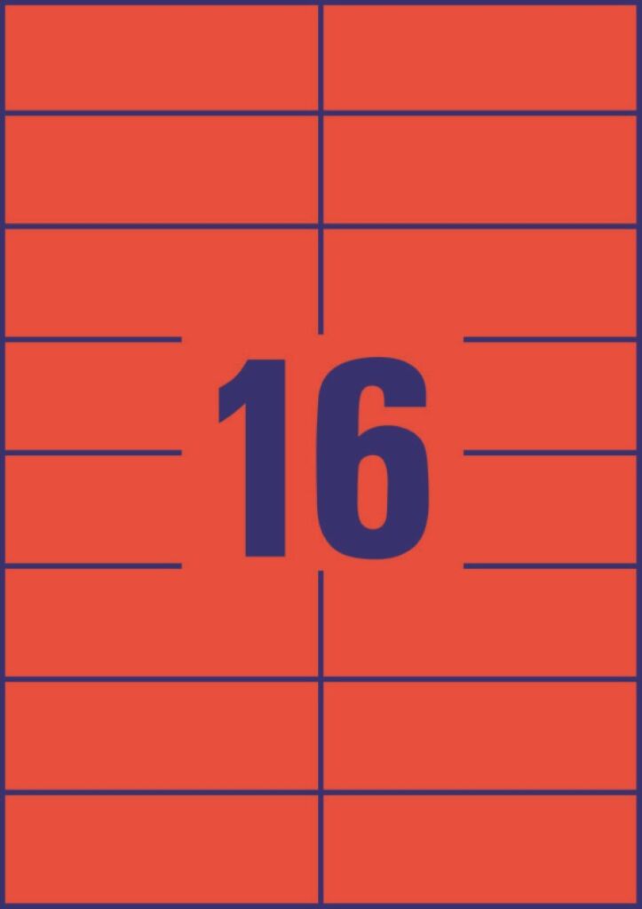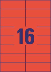 rozměr 105×37 mm, 100 archů A4, 1.600 ks etiket v balení (16 ks/arch), papírové, permanentní lepidlo, barva červená. Typ tiskárny: černobílá laserová, barevná laserová, inkoustová.