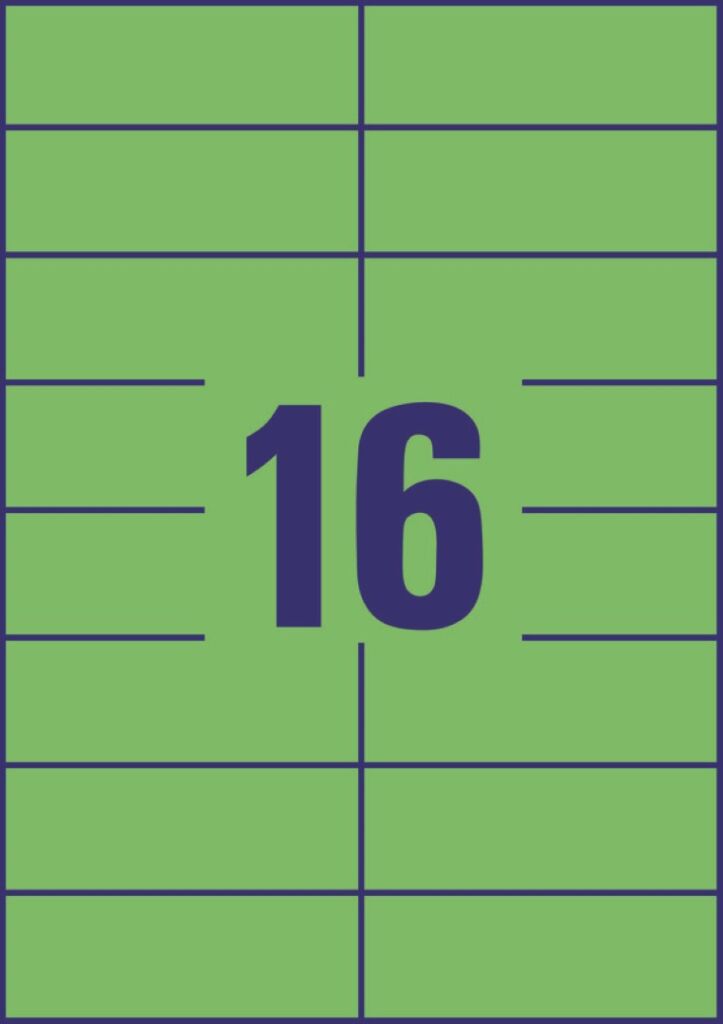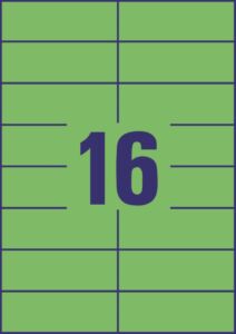 rozměr 105×37 mm, 100 archů A4, 1.600 ks etiket v balení (16 ks/arch), papírové, permanentní lepidlo, barva zelená. Typ tiskárny: černobílá laserová, barevná laserová, inkoustová.