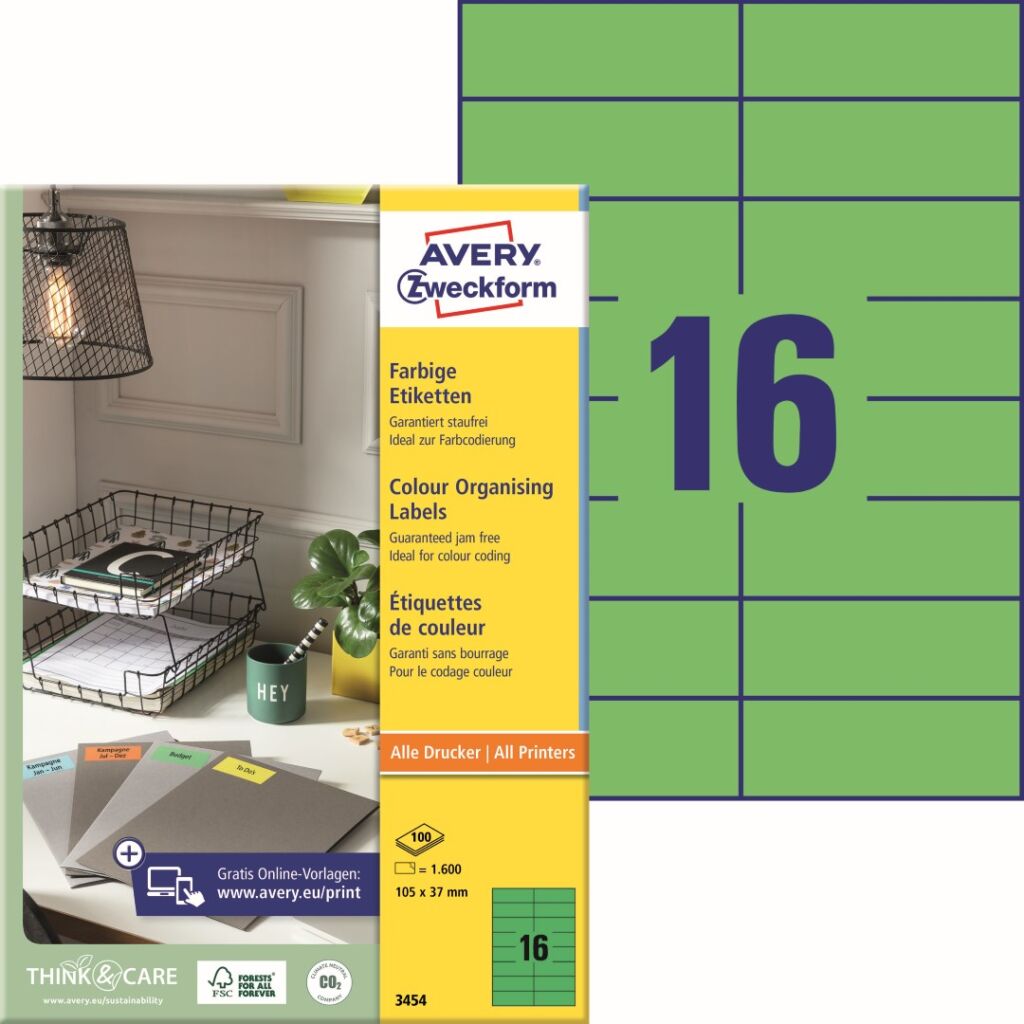 Zelené samolepící etikety Avery Zweckform 3454 do kanceláře, obchodu i domácnosti, pro všestranné a spolehlivé použití. Ideální pro tematické barevné rozlišování nebo označování, akční a varovné samolepky, značení ve skladech a logistice, přehledné archivaci atd. Naše barevné etikety se vyznačují vysokou lepivostí na různých typech povrchů. Při tisku se můžete spolehnout na plynulý průjezd archů tiskárnou bez uvíznutí a ostrý tiskový výstup, který se díky vynikajícímu ukotvení tonerového prášku či inkoustu nerozmazává. Samozřejmostí je čtyřstranný bezpečnostní okraj QCT (Quattro Clean Technology), který zabraňuje vytékání a usazování lepidla v tiskárně. Zelené print etikety Avery Zweckform 3454 jsou vhodné pro všechny běžné laserové i inkoustové tiskárny, kopírovací stroje a hodí se i pro psaní, resp. ruční popis.