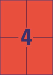 rozměr 105×148 mm, 100 archů A4, 400 ks etiket v balení (4 ks/arch), papírové, permanentní lepidlo, barva červená. Typ tiskárny: černobílá laserová, barevná laserová, inkoustová.