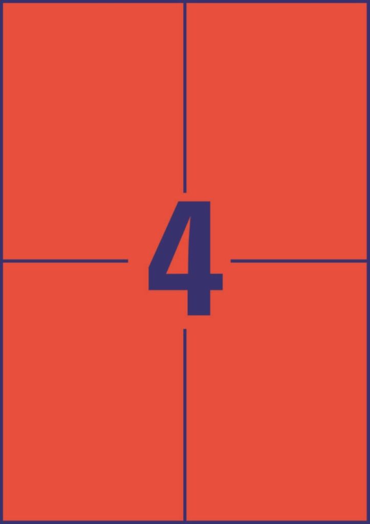 100 archů A4, rozměr 105x148 mm, 400 ks etiket v balení, papírové, permanentní lepidlo, barva červená. Typ tiskárny: černobílá laserová, barevná laserová, inkoustová.
