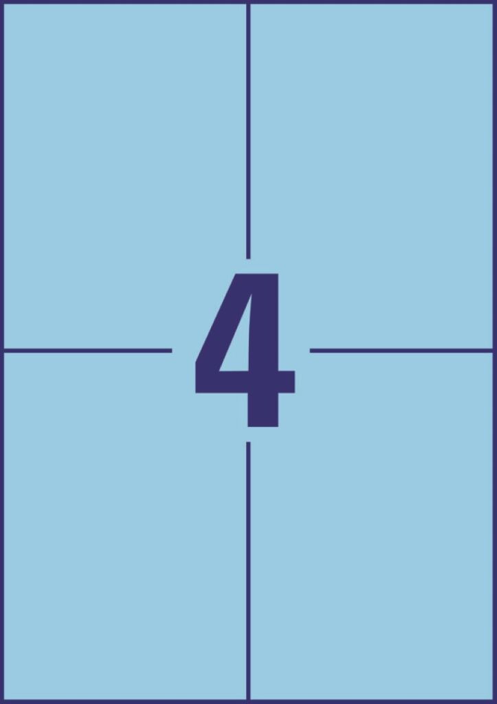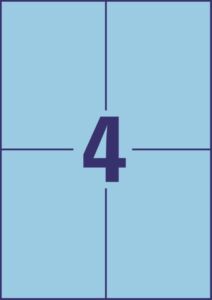 100 archů A4, rozměr 105x148 mm, 400 ks etiket v balení, papírové, permanentní lepidlo, barva modrá. Typ tiskárny: černobílá laserová, barevná laserová, inkoustová.