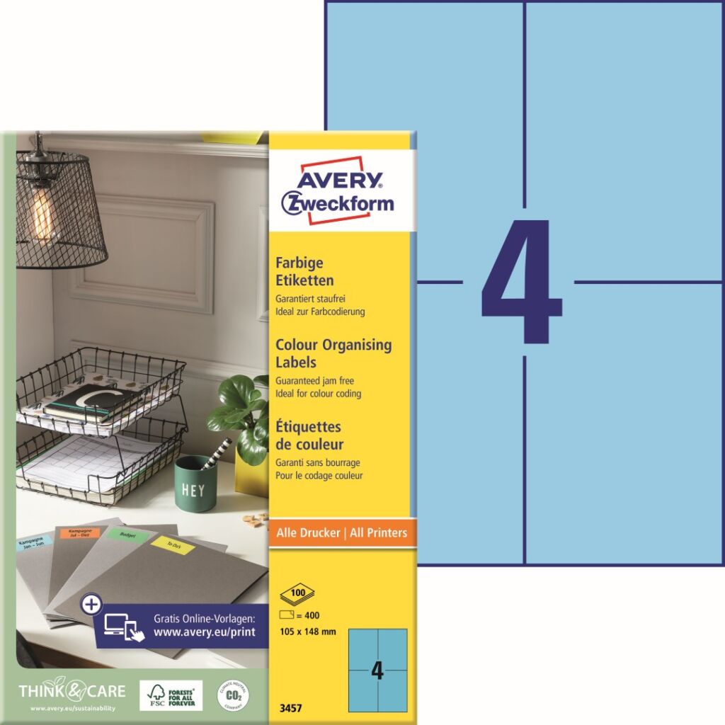 Modré samolepící etikety Avery Zweckform 3457 do kanceláře, obchodu i domácnosti, pro všestranné a spolehlivé použití. Ideální pro tematické barevné rozlišování nebo označování, akční a varovné samolepky, značení ve skladech a logistice, přehledné archivaci atd. Naše barevné etikety se vyznačují vysokou lepivostí na různých typech povrchů. Při tisku se můžete spolehnout na plynulý průjezd archů tiskárnou bez uvíznutí a ostrý tiskový výstup, který se díky vynikajícímu ukotvení tonerového prášku či inkoustu nerozmazává. Samozřejmostí je čtyřstranný bezpečnostní okraj QCT (Quattro Clean Technology), který zabraňuje vytékání a usazování lepidla v tiskárně. Print etikety modré Avery Zweckform 3457 jsou vhodné pro všechny běžné laserové i inkoustové tiskárny, kopírovací stroje a hodí se i pro psaní, resp. ruční popis.