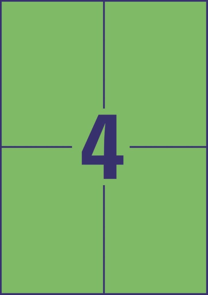 100 archů A4, rozměr 105x148 mm, 400 ks etiket v balení, papírové, permanentní lepidlo, barva zelená. Typ tiskárny: černobílá laserová, barevná laserová, inkoustová.