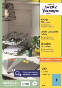 Modré samolepící etikety Avery Zweckform 3471 do kanceláře, obchodu i domácnosti, pro všestranné a spolehlivé použití. Ideální pro tematické barevné rozlišování nebo označování, akční a varovné samolepky, značení ve skladech a logistice, přehledné archivaci atd. Naše barevné etikety se vyznačují vysokou lepivostí na různých typech povrchů. Při tisku se můžete spolehnout na plynulý průjezd archů tiskárnou bez uvíznutí a ostrý tiskový výstup, který se díky vynikajícímu ukotvení tonerového prášku či inkoustu nerozmazává. Samozřejmostí je čtyřstranný bezpečnostní okraj QCT (Quattro Clean Technology), který zabraňuje vytékání a usazování lepidla v tiskárně. Arch má ze zadní strany tzv. split, což je násek nosného papíru pro snadnější sejmutí etikety. Barevné print etikety Avery Zweckform 3471 jsou vhodné pro všechny běžné laserové i inkoustové tiskárny, kopírovací stroje a hodí se i pro psaní, resp. ruční popis.