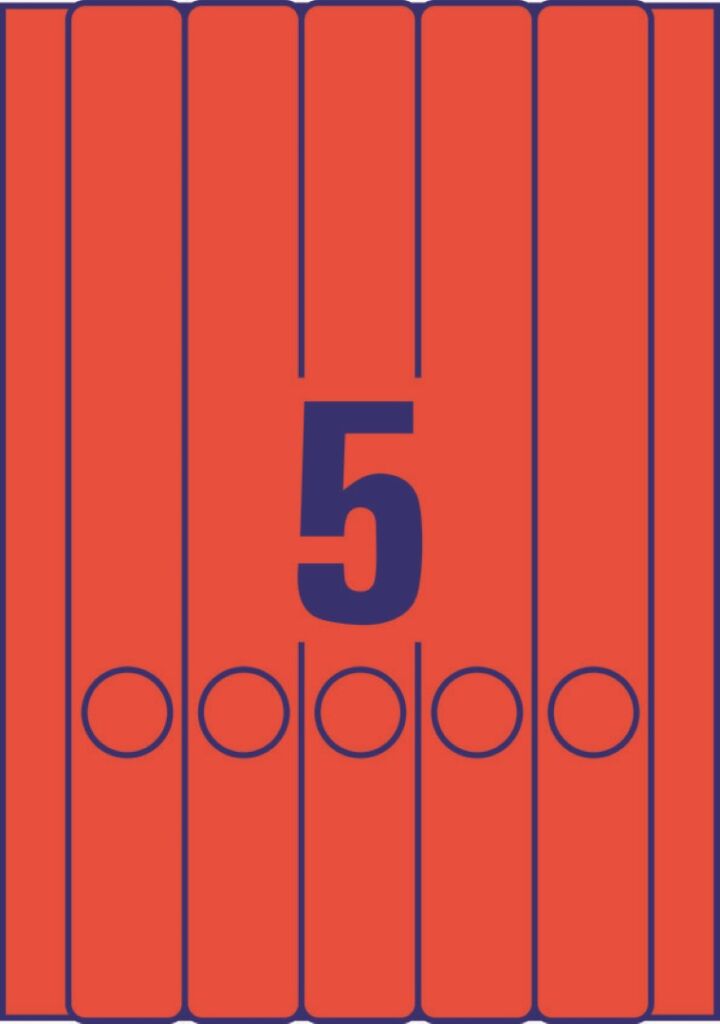 rozměr 38×297 mm, 20 archů A4, 100 ks etiket v balení (5 ks/arch), papírové, permanentní lepidlo, barva červená. Typ tiskárny: černobílá laserová, barevná laserová, inkoustová.