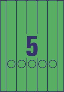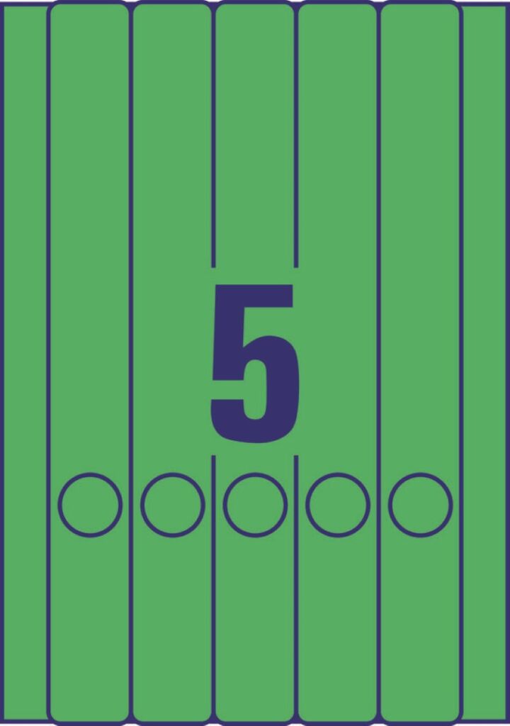 rozměr 38×297 mm, 20 archů A4, 100 ks etiket v balení (5 ks/arch), papírové, permanentní lepidlo, barva zelená. Typ tiskárny: černobílá laserová, barevná laserová, inkoustová.