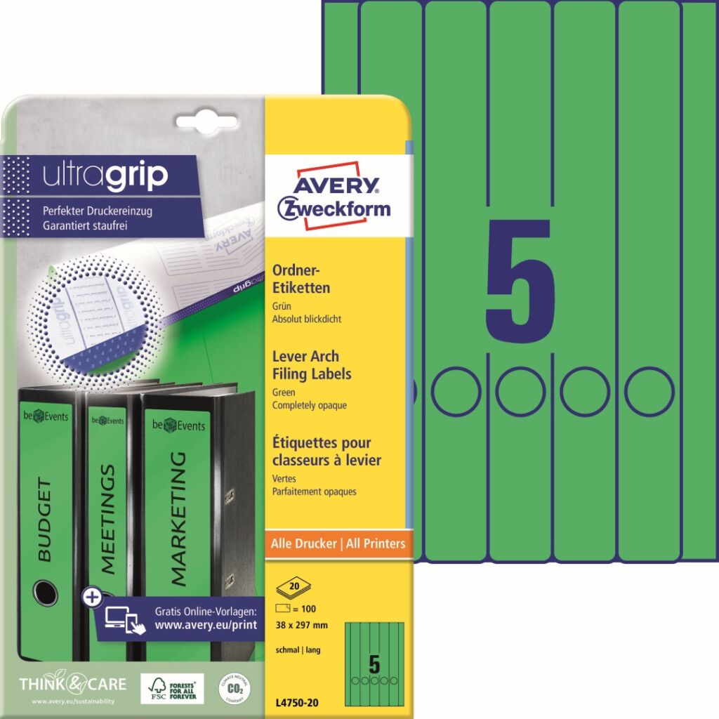 Zelené etikety na pořadače Avery Zweckform L4750-20 dodají Vaší kanceláři jednotný vzhled, strukturu a řád. Potištěné hřbety pořadačů vypadají profesionálně, zjednoduší práci a ušetří čas při hledání dokumentů. Dlouhý formát je vhodný pro úzké pořadače značek Leitz, Elba, Esselte, Mehle, Herlitz, Bene atd. Etikety jsou 100% zcela neprůhledné a kompletně zakryjí starý text nebo etiketu. Novinka! Unikátní výrobní technologie Ultragrip – do oblasti záhlaví, zápatí a na boční okraje zadní strany archu s etiketami aplikovaná jemná vrstva laku a 3D strukturovaný povrch, který společně s vyznačenými okraji a vodícími linkami zaručí bezchybné natažení archu do tiskárny a absolutně přesný tisk bez rizika uvíznutí archu v tiskárně. Ukázka viz 2. Video (záložka výše). Při tisku se můžete spolehnout na čtyřstranný bezpečnostní okraj QCT (Quattro Clean Technology), který zabraňuje vytékání a usazování lepidla v tiskárně a ostrý tiskový výstup, který se díky vynikajícímu ukotvení tonerového prášku nebo inkoustu nerozmazává. Zelené štítky na pořadače Avery Zweckform L4750-20 jsou vhodné pro všechny běžné laserové i inkoustové tiskárny, kopírovací stroje a hodí se i pro psaní, resp. ruční popis.