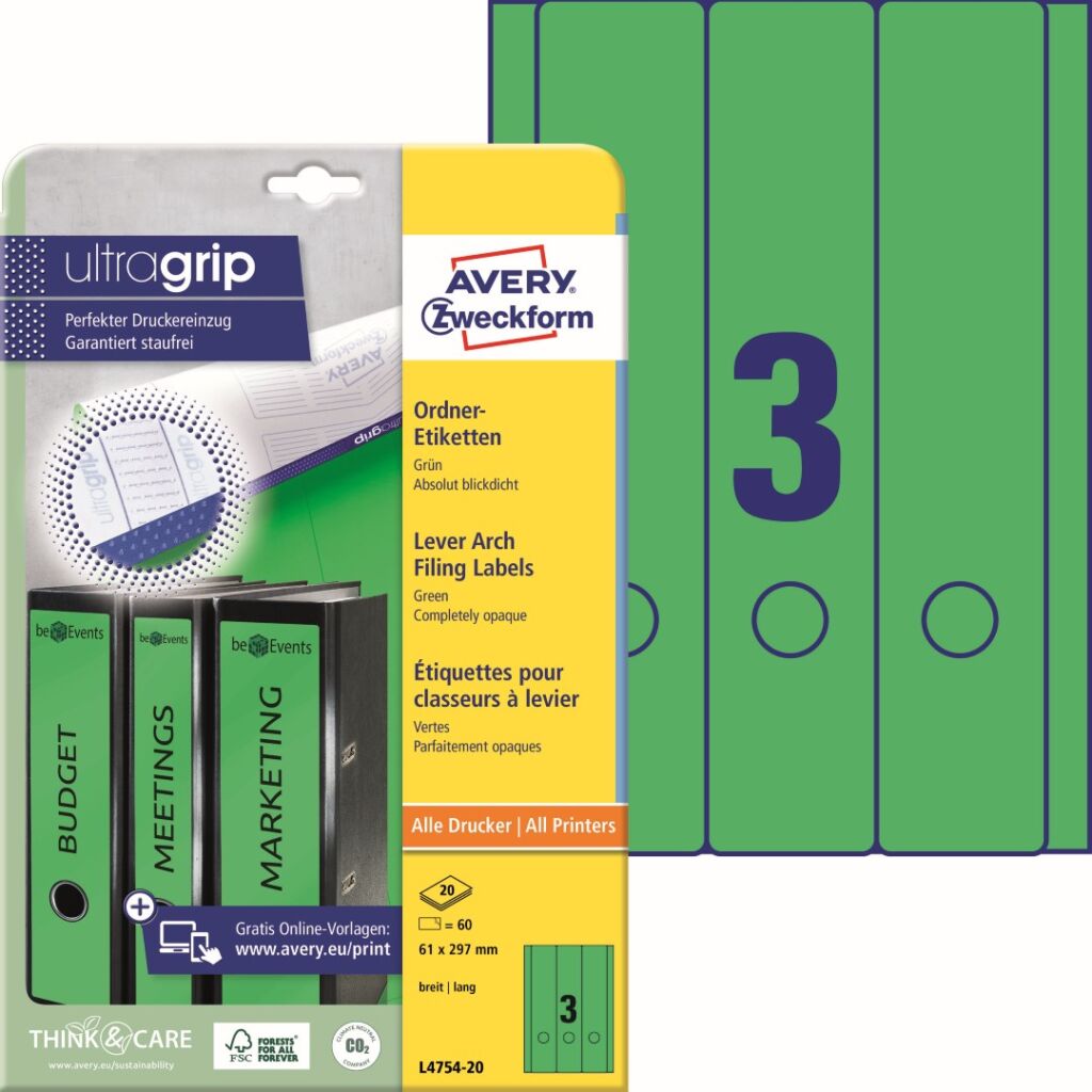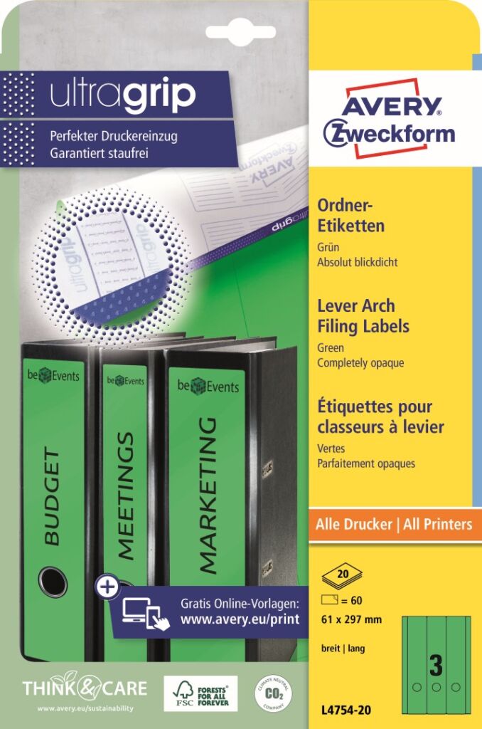 Zelené etikety na pořadače Avery Zweckform L4754-20 dodají Vaší kanceláři jednotný vzhled, strukturu a řád. Potištěné hřbety pořadačů vypadají profesionálně, zjednoduší práci a ušetří čas při hledání dokumentů. Dlouhý formát je vhodný pro široké pořadače značek Leitz, Elba, Esselte, Falken, Mehle, Herlitz, Bene atd. Etikety jsou 100% zcela neprůhledné a kompletně zakryjí starý text nebo etiketu. Novinka! Unikátní výrobní technologie Ultragrip – do oblasti záhlaví, zápatí a na boční okraje zadní strany archu s etiketami aplikovaná jemná vrstva laku a 3D strukturovaný povrch, který společně s vyznačenými okraji a vodícími linkami zaručí bezchybné natažení archu do tiskárny a absolutně přesný tisk bez rizika uvíznutí archu v tiskárně. Ukázka viz 2. Video (záložka výše). Při tisku se můžete spolehnout na čtyřstranný bezpečnostní okraj QCT (Quattro Clean Technology), který zabraňuje vytékání a usazování lepidla v tiskárně a ostrý tiskový výstup, který se díky vynikajícímu ukotvení tonerového prášku nebo inkoustu nerozmazává. Zelené štítky na pořadače Avery Zweckform L4754-20 jsou vhodné pro všechny běžné laserové i inkoustové tiskárny, kopírovací stroje a hodí se i pro psaní, resp. ruční popis.