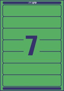 rozměr 38×192 mm, 20 archů A4, 140 ks etiket v balení (7 ks/arch), papírové, permanentní lepidlo, barva zelená. Typ tiskárny: černobílá laserová, barevná laserová, inkoustová.