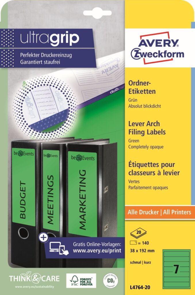 Zelené etikety na pořadače Avery Zweckform L4764-20 dodají Vaší kanceláři jednotný vzhled, strukturu a řád. Potištěné hřbety pořadačů vypadají profesionálně, zjednoduší práci a ušetří čas při hledání dokumentů. Krátký formát je vhodný pro úzké pořadače značek Leitz, Elba, Esselte, Mehle, Herlitz, Bene atd. Etikety jsou 100% zcela neprůhledné a kompletně zakryjí starý text nebo etiketu. Novinka! Unikátní výrobní technologie Ultragrip – do oblasti záhlaví, zápatí a na boční okraje zadní strany archu s etiketami aplikovaná jemná vrstva laku a 3D strukturovaný povrch, který společně s vyznačenými okraji a vodícími linkami zaručí bezchybné natažení archu do tiskárny a absolutně přesný tisk bez rizika uvíznutí archu v tiskárně. Ukázka viz 2. Video (záložka výše). Při tisku se můžete spolehnout na čtyřstranný bezpečnostní okraj QCT (Quattro Clean Technology), který zabraňuje vytékání a usazování lepidla v tiskárně a ostrý tiskový výstup, který se díky vynikajícímu ukotvení tonerového prášku nebo inkoustu nerozmazává. Zelené štítky na pořadače Avery Zweckform L4764-20 jsou vhodné pro všechny běžné laserové i inkoustové tiskárny, kopírovací stroje a hodí se i pro psaní, resp. ruční popis.