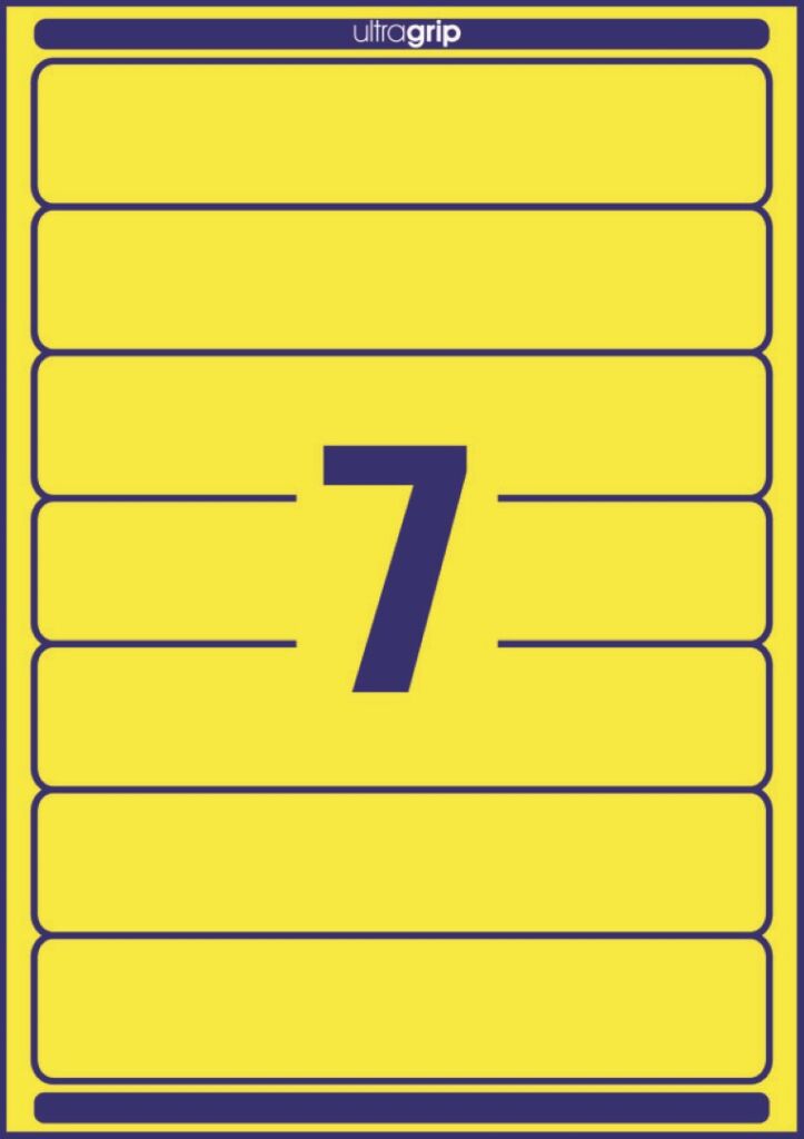 rozměr 38×192 mm, 20 archů A4, 140 ks etiket v balení (7 ks/arch), papírové, permanentní lepidlo, barva žlutá. Typ tiskárny: černobílá laserová, barevná laserová, inkoustová.
