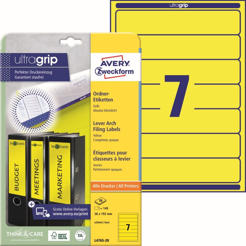 Žluté etikety na pořadače Avery Zweckform L4765-20 dodají Vaší kanceláři jednotný vzhled, strukturu a řád. Potištěné hřbety pořadačů vypadají profesionálně, zjednoduší práci a ušetří čas při hledání dokumentů. Krátký formát je vhodný pro úzké pořadače značek Leitz, Elba, Esselte, Mehle, Herlitz, Bene atd. Etikety jsou 100% zcela neprůhledné a kompletně zakryjí starý text nebo etiketu. Novinka! Unikátní výrobní technologie Ultragrip – do oblasti záhlaví, zápatí a na boční okraje zadní strany archu s etiketami aplikovaná jemná vrstva laku a 3D strukturovaný povrch, který společně s vyznačenými okraji a vodícími linkami zaručí bezchybné natažení archu do tiskárny a absolutně přesný tisk bez rizika uvíznutí archu v tiskárně. Ukázka viz 2. Video (záložka výše). Při tisku se můžete spolehnout na čtyřstranný bezpečnostní okraj QCT (Quattro Clean Technology), který zabraňuje vytékání a usazování lepidla v tiskárně a ostrý tiskový výstup, který se díky vynikajícímu ukotvení tonerového prášku nebo inkoustu nerozmazává. Žluté štítky na pořadače Avery Zweckform L4765-20 jsou vhodné pro všechny běžné laserové i inkoustové tiskárny, kopírovací stroje a hodí se i pro psaní, resp. ruční popis.