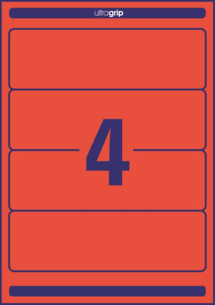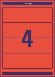 rozměr 61×192 mm, 100 archů A4, 400 ks etiket v balení (4 ks/arch), papírové, permanentní lepidlo, barva červená. Typ tiskárny: černobílá laserová, barevná laserová, inkoustová.