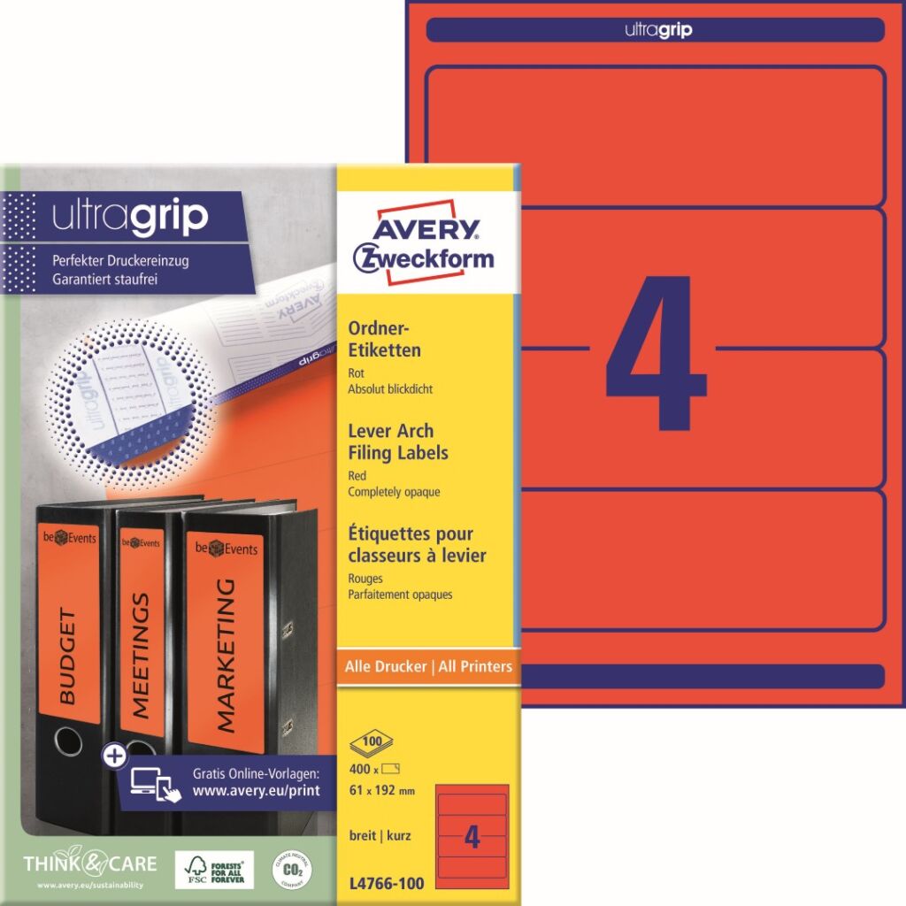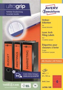 Červené samolepící etikety na pořadače Avery Zweckform L4766-100 dodají Vaší kanceláři jednotný vzhled, strukturu a řád. Potištěné hřbety pořadačů vypadají profesionálně, zjednoduší práci a ušetří čas při hledání dokumentů. Krátký formát je vhodný pro široké pořadače značek Leitz, Elba, Falken, Mehle, Bene, Biella atd. Etikety jsou 100% zcela neprůhledné a kompletně zakryjí starý text nebo etiketu. Novinka! Unikátní výrobní technologie Ultragrip – do oblasti záhlaví, zápatí a na boční okraje zadní strany archu s etiketami aplikovaná jemná vrstva laku a 3D strukturovaný povrch, který společně s vyznačenými okraji a vodícími linkami zaručí bezchybné natažení archu do tiskárny a absolutně přesný tisk bez rizika uvíznutí archu v tiskárně. Ukázka viz 2. Video (záložka výše). Při tisku se můžete spolehnout na čtyřstranný bezpečnostní okraj QCT (Quattro Clean Technology), který zabraňuje vytékání a usazování lepidla v tiskárně a ostrý tiskový výstup, který se díky vynikajícímu ukotvení tonerového prášku nebo inkoustu nerozmazává. Červené samolepící štítky na pořadače Avery Zweckform L4766-100 jsou vhodné pro všechny běžné laserové i inkoustové tiskárny, kopírovací stroje a hodí se i pro psaní, resp. ruční popis.