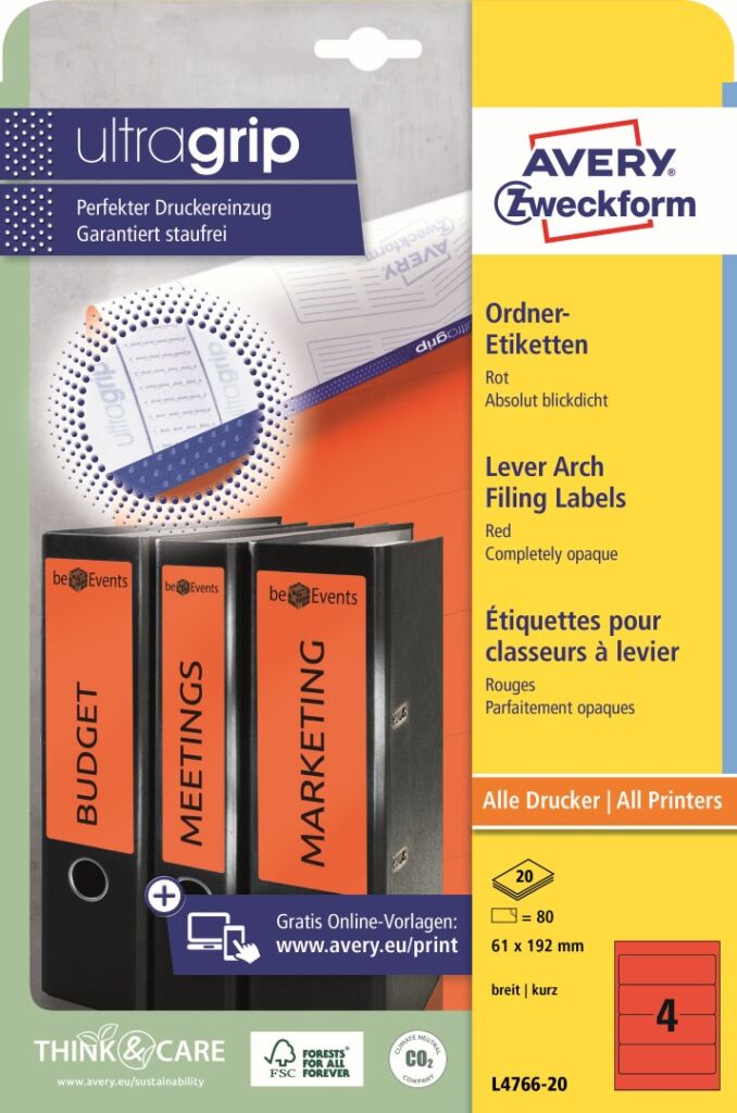 Červené etikety na pořadače Avery Zweckform L4766-20 dodají Vaší kanceláři nebo domácí pracovně jednotný vzhled, strukturu a řád. Potištěné hřbety pořadačů vypadají profesionálně, zjednoduší práci a ušetří čas při hledání dokumentů. Krátký formát je vhodný pro široké pořadače značek Leitz, Elba, Falken, Mehle, Bene, Biella atd. Etikety jsou 100% zcela neprůhledné a kompletně zakryjí starý text nebo etiketu. Novinka! Unikátní výrobní technologie Ultragrip – do oblasti záhlaví, zápatí a na boční okraje zadní strany archu s etiketami aplikovaná jemná vrstva laku a 3D strukturovaný povrch, který společně s vyznačenými okraji a vodícími linkami zaručí bezchybné natažení archu do tiskárny a absolutně přesný tisk bez rizika uvíznutí archu v tiskárně. Ukázka viz 2. Video (záložka výše). Při tisku se můžete spolehnout na čtyřstranný bezpečnostní okraj QCT (Quattro Clean Technology), který zabraňuje vytékání a usazování lepidla v tiskárně a ostrý tiskový výstup, který se díky vynikajícímu ukotvení tonerového prášku nebo inkoustu nerozmazává. Červené štítky na pořadače Avery Zweckform L4766-20 jsou vhodné pro všechny běžné laserové i inkoustové tiskárny, kopírovací stroje a hodí se i pro psaní, resp. ruční popis.