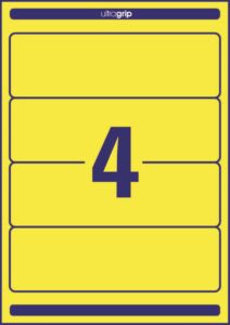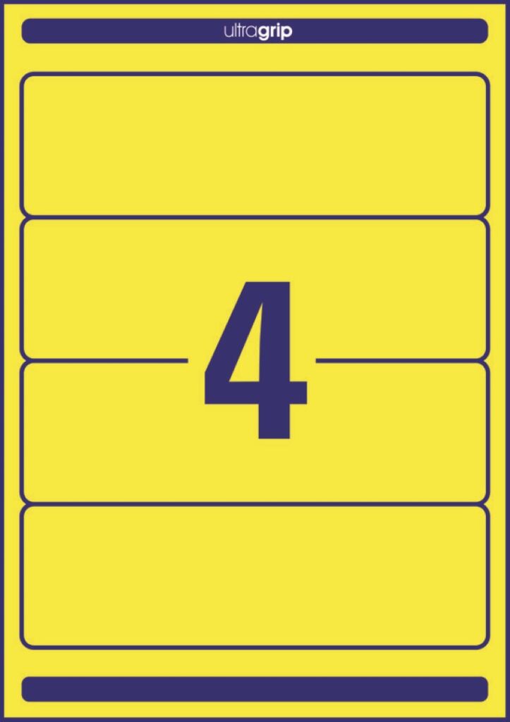 rozměr 61×192 mm, 100 archů A4, 400 ks etiket v balení (4 ks/arch), papírové, permanentní lepidlo, barva žlutá. Typ tiskárny: černobílá laserová, barevná laserová, inkoustová.
