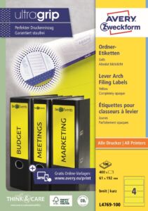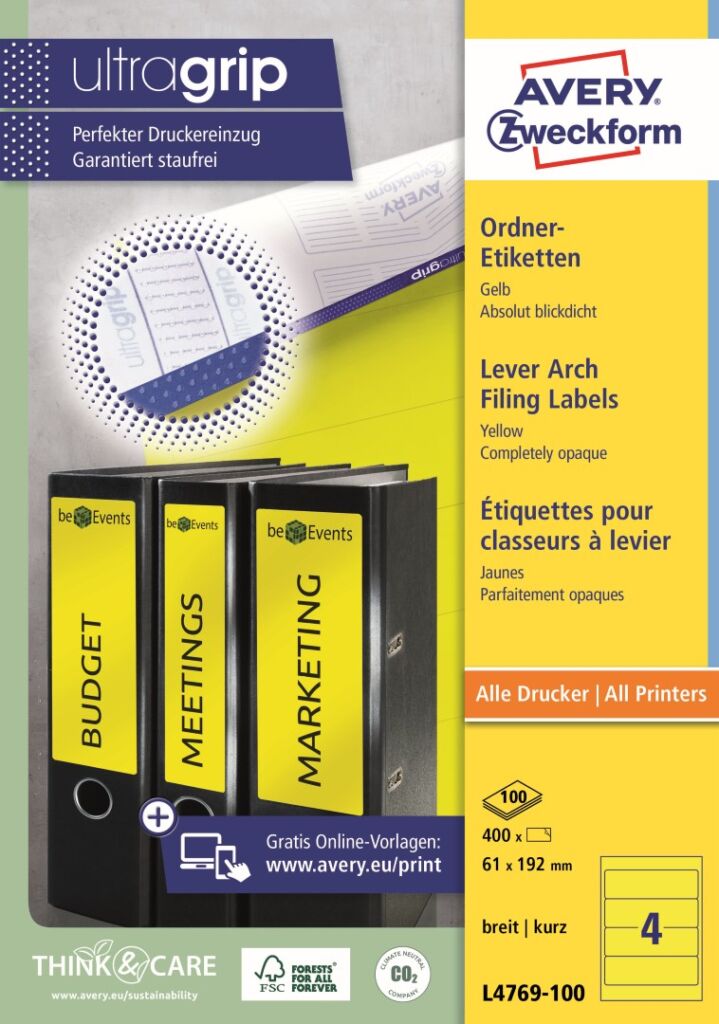 Žluté samolepící etikety na pořadače Avery Zweckform L4769-100 dodají Vaší kanceláři jednotný vzhled, strukturu a řád. Potištěné hřbety pořadačů vypadají profesionálně, zjednoduší práci a ušetří čas při hledání dokumentů. Krátký formát je vhodný pro široké pořadače značek Leitz, Elba, Falken, Mehle, Bene, Biella atd. Etikety jsou 100% zcela neprůhledné a kompletně zakryjí starý text nebo etiketu. Novinka! Unikátní výrobní technologie Ultragrip – do oblasti záhlaví, zápatí a na boční okraje zadní strany archu s etiketami aplikovaná jemná vrstva laku a 3D strukturovaný povrch, který společně s vyznačenými okraji a vodícími linkami zaručí bezchybné natažení archu do tiskárny a absolutně přesný tisk bez rizika uvíznutí archu v tiskárně. Ukázka viz 2. Video (záložka výše). Při tisku se můžete spolehnout na čtyřstranný bezpečnostní okraj QCT (Quattro Clean Technology), který zabraňuje vytékání a usazování lepidla v tiskárně a ostrý tiskový výstup, který se díky vynikajícímu ukotvení tonerového prášku nebo inkoustu nerozmazává. Žluté samolepící štítky na pořadače Avery Zweckform L4769-100 jsou vhodné pro všechny běžné laserové i inkoustové tiskárny, kopírovací stroje a hodí se i pro psaní, resp. ruční popis.