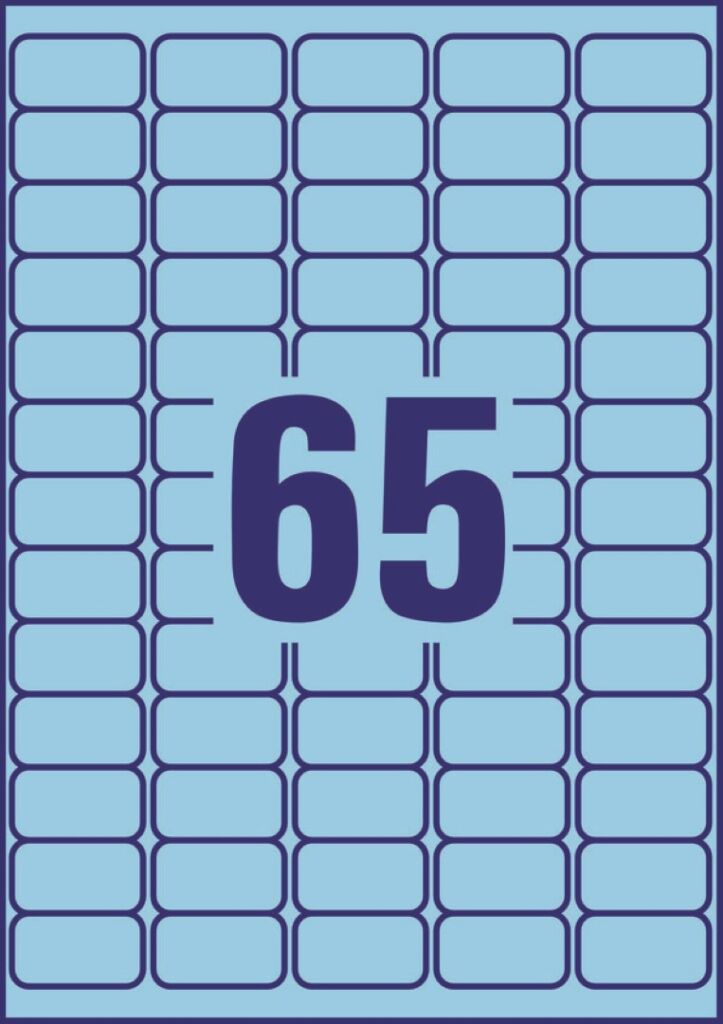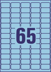 rozměr 38,1×21,2 mm, 20 archů A4, 1.300 ks etiket v balení (65 ks/arch), papírové, snímatelné lepidlo, barva modrá. Typ tiskárny: černobílá laserová, barevná laserová, inkoustová.