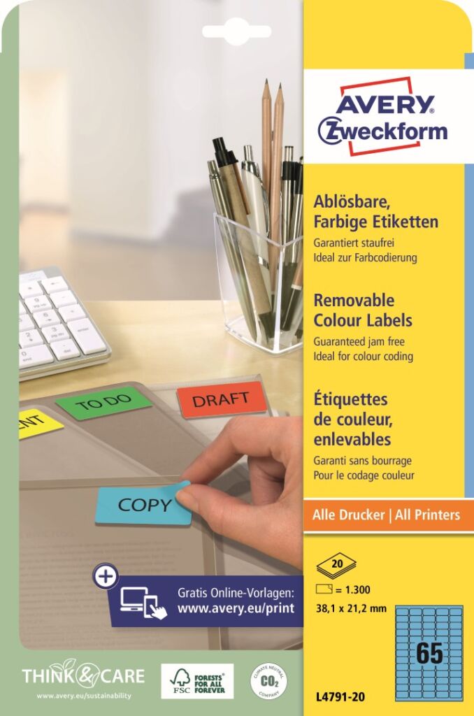 Modré odnímatelné etikety Avery Zweckform L4791-20 do kanceláře, obchodu i domácnosti, ideální na veškeré dočasné nebo měnící se značení. Etikety se snímatelným lepidlem spolehlivě a bezpečně drží, a naopak je můžete snadno odlepit, bez zanechání žádných stop zbytkového lepidla. Ukázka viz Videa (záložka výše). Při tisku se můžete spolehnout na plynulý průjezd archů tiskárnou bez uvíznutí a ostrý tiskový výstup, který se díky vynikajícímu ukotvení tonerového prášku či inkoustu nerozmazává. Samozřejmostí je čtyřstranný bezpečnostní okraj QCT (Quattro Clean Technology), který zabraňuje vytékání a usazování lepidla v tiskárně. Barevné snímatelné etikety Avery Zweckform L4791-20 jsou vhodné pro všechny běžné laserové i inkoustové tiskárny, kopírovací stroje a hodí se i pro psaní, resp. ruční popis.