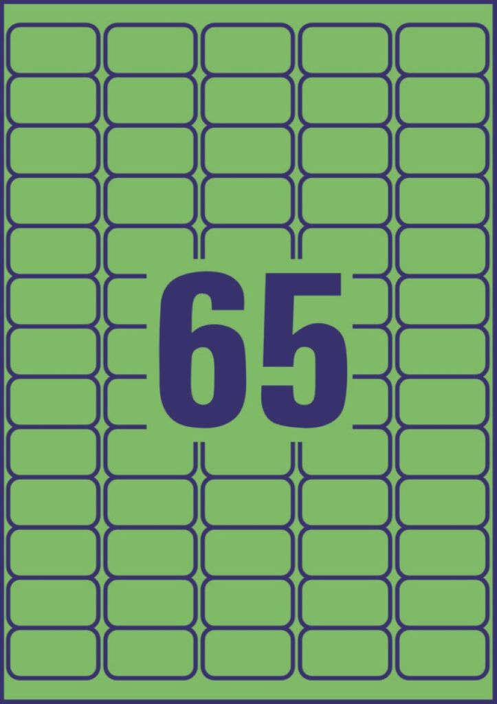 rozměr 38,1×21,2 mm, 20 archů A4, 1.300 ks etiket v balení (65 ks/arch), papírové, snímatelné lepidlo, barva zelená. Typ tiskárny: černobílá laserová, barevná laserová, inkoustová.