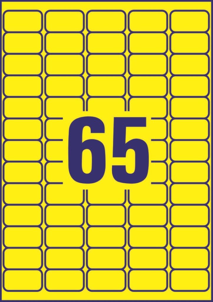 rozměr 38,1×21,2 mm, 20 archů A4, 1.300 ks etiket v balení (65 ks/arch), papírové, snímatelné lepidlo, barva žlutá. Typ tiskárny: černobílá laserová, barevná laserová, inkoustová.