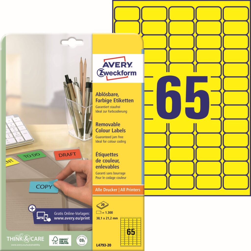 Žluté odnímatelné etikety Avery Zweckform L4793-20 do kanceláře, obchodu i domácnosti, ideální na veškeré dočasné nebo měnící se značení. Etikety se snímatelným lepidlem spolehlivě a bezpečně drží, a naopak je můžete snadno odlepit, bez zanechání žádných stop zbytkového lepidla. Ukázka viz Videa (záložka výše). Při tisku se můžete spolehnout na plynulý průjezd archů tiskárnou bez uvíznutí a ostrý tiskový výstup, který se díky vynikajícímu ukotvení tonerového prášku či inkoustu nerozmazává. Samozřejmostí je čtyřstranný bezpečnostní okraj QCT (Quattro Clean Technology), který zabraňuje vytékání a usazování lepidla v tiskárně. Barevné snímatelné etikety Avery Zweckform L4793-20 jsou vhodné pro všechny běžné laserové i inkoustové tiskárny, kopírovací stroje a hodí se i pro psaní, resp. ruční popis.